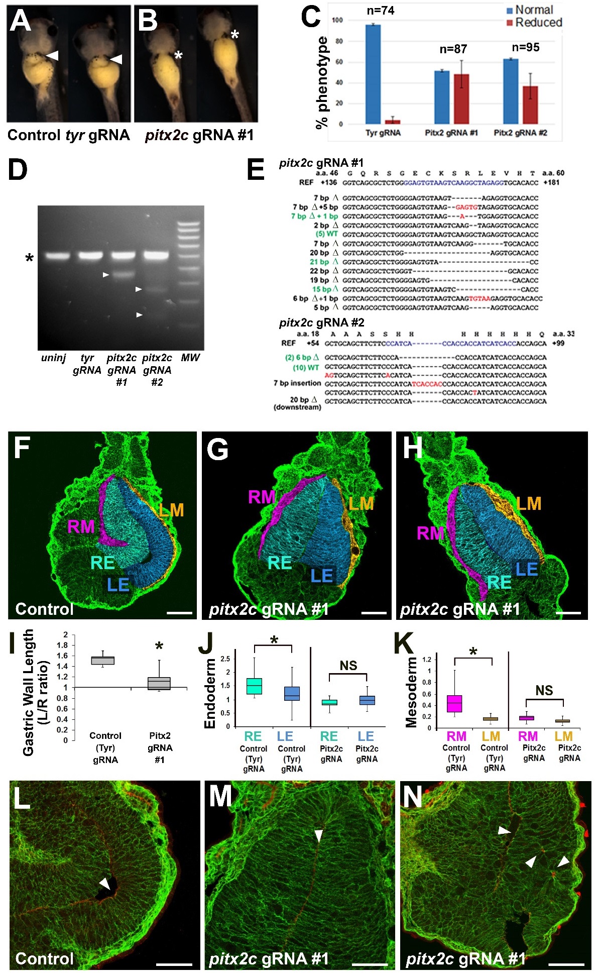 Figure S5. CRISPR-Cas9 mediated editing of pitx2c gene perturbs stomach asymmetry. Xenopus embryos were injected with 2 ng synthetic Cas9 mRNA plus 300 pg control tyrosinase (tyr) gRNA (A) or pitx2c gRNA (B), and allowed to develop until stage 42. The graph (C) indicates the percentage of embryos in which the greater curvature of the stomach is normal (arrowhead in A) or reduced/absent (* in B) after injection with the tyr gRNA or two different pitx2c gRNAs (#1 and #2). D) Genomic DNA from 10 embryos injected with each gRNA was pooled and PCR amplified using exon 1-specific primers, and then tested for CRISPR/Cas9-induced mutations by T7 endonuclease I assay. The asterisk (*) indicates the 500 bp amplicon not cut in un-injected or tyr gRNA-injected control embryos. Arrowheads indicate bands resulting from mismatches (inferred mutations) in amplicons cleaved by T7 endonuclease I. E) Sequencing of a subset of individual clones validates the presence of deleterious mutations in pitx2c gRNA injected embryos. For pitx2c gRNA #1, 9/17 mutations were likely nulls and 3/17 were predicted to result in compromised function; for pitx2c gRNA #2: 2/18 mutations were likely nulls and 4/17 were likely to result in compromised function. F-N) Sections through stomachs of Cas9 control and pitx2c gRNA (#1) injected embryos (Stage 39) were stained for integrin (green) and false color-coded as in Fig. 1 to highlight the relevant tissue layers (RE, right endoderm; LE, left endoderm; RM, right mesoderm; LM, left mesoderm). Controls show normal asymmetric expansion of the left stomach wall (F), but this is eliminated in embryos injected with pitx2c gRNA (G-H). Normal asymmetries in the lengths of the left and right stomach walls (I), and the widths of the endoderm (Endo) and mesoderm (Meso) layers (J-K), are also significantly perturbed by CRISPR-Cas editing of pitx2c; * denotes p<0.01. Compared to controls (L), left endoderm tissue architecture is severely disrupted, and apicobasal polarity is reduced (M), and/or disorganized (N) in embryos with CRISPR-mediated mutations in pitx2c; arrowheads indicate the expression of the apical marker aPKC (red). Scalebars= 100 ïM. |