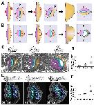 Fig. 1. Early stomach undergoes leftward expansion. The rotation model (A) posits that the embryonic stomach (shown in ventral views and cross-sections at successive stages) rotates around its longitudinal axis, shifting its dorsal face leftward. An alternative model (B) theorizes that the left wall expands more than the right. Sections of E10.5, E11 and E11.5 mouse embryos (C) or stage 34, 37 and 39 frog embryos (E) reveal the leftward expansion of the early stomach. The left/ right ratio of the lengths of the stomach walls becomes significantly greater than 1 in mouse by E11 (D) and in frog by stage 39 (F); *P<0.05. Sections in C and E are false-colored to match diagrams in A and B, highlighting layers of the stomach: right mesoderm, pink; right endoderm, teal; left endoderm, blue; left mesoderm, gold. In all sections, dorsal is upwards and the left side of animal is on right side of image. D, dorsal; V, ventral; L, left; R, right. Scale bars: 500 μm in C (E11.5, 150 μm); 75 μM in E. |