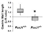 Figure S1. The normal left/right ratio of the lengths of the stomach walls is eliminated in E11.5 FoxJ1-/- mouse stomachs (* denotes p<0.01). |