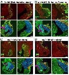 Figure S7. Reciprocal endoderm-mesoderm interactions affect morphogenesis of the left stomach wall. Frog embryos were injected with GFP mRNA and either control morpholino (Co-MO; A) or pitx2c-MO (B-D), targeted to the left side of the stomach. Top panels: sections through the stomach were stained for ï¢-catenin (ï¢cat; red) and GFP (green). Bottom panels: the same sections were false color-coded as in Fig. 1(b) to highlight the relevant tissue layers (RE, right endoderm; LE, left endoderm; RM, right mesoderm; LM, left mesoderm). In the embryo shown in A, Control-MO is distributed throughout the LE and LM of the left stomach wall, which exhibits normal left side tissue architecture. In the embryo shown in B, pitx2c-MO is distributed throughout the LE and LM, and both tissue layers are abnormally thickened and/or disorganized. In C, pitx2c-MO is present predominately in the LE, with minimal contribution to the LM; yet, both the LE and LM are abnormal. Likewise, in D, pitx2c-MO is present only in the LM, with minimal contribution to LE, but both LE and LM are abnormal. |