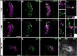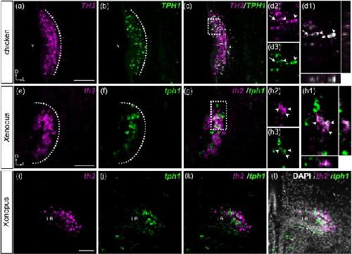 Figure 7. Colocalization of TH2 and TPH1 in the PVO of chicken and Xenopus. Frontal sections obtained from the PVO of chicken (aâd) and Xenopus (eâl) are shown. TH2 (a; magenta) and TPH1 (b; green) transcripts are observed in the same region of the chicken PVO, and some CSF-c cells coexpress both genes (c, d; white). The area depicted by a dashed rectangle in (c) is shown in (d1âd3) at higher magnification. Optical sectioning by confocal microscopy shows that TH2 (d2) and TPH1 (d3) are expressed in the soma (arrowheads) and in the processes of CSF-contacting cells (arrow). Orthogonal views of optical sections confirm the overlap of TH2 and TPH1 signals. In Xenopus, th2 (e, i; magenta) and tph1 (f, j; green) are expressed both in the rostromedial (eâh) and the caudolateral (iâl) parts of the PVO. Some CSF-c cells coexpress both genes (g, k). The coexpression is confirmed by orthogonal views of optical sections (h1) of the area depicted by a dashed rectangle in (g), showing that th2 (h2) and tph1 (h3) are colocalized in the same cells (arrowheads). Dâ=âdorsal; Lâ=âlateral; LRâ=âlateral recess; vâ=âventricle. Scale barâ=â100 µm in (a) (applies to a, b, c) and in (e) (applies to e, f, g); 50 µm in (i) (applies to i, j, k, l) |