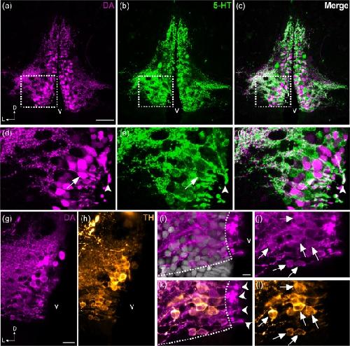 Figure 9. Colocalization of DA and 5‐HT in the PVO cells of zebrafish. Frontal sections of the anterior PVO (PVOa) in adult zebrafish demonstrate that CSF‐c cells are immunoreactive to DA (magenta; a, d) and to 5‐HT (green; b, e). The areas in dashed rectangles in (a), (b), and (c) are shown at higher magnification (Z‐projection = 5 µm) in (d), (e), and (f) respectively. Both monoamines were observed in a few cell bodies (arrow in f) and endfeet (arrowhead in f). In teleosts, some of the DA+ CSF‐c cells (g) are also immunoreactive for TH (h; orange). Higher magnification images of the PVO are shown in (i–l). In CSF‐c cells, intense DA immunoreactivity is present in the cell soma (j; arrows), processes, and the endfeet contacting the ventricle (k; arrowheads). In contrast, intense TH immunoreactivity is mostly observed in the soma and processes (l; arrows), but not in the endfeet. D = dorsal; L = lateral; v = ventricle. Scale bar = 50 µm in (a) (applies to a, b, c); 200 µm in (g) (applies to g, h); 100 µm in (i) (applies to i, j, k, l) |