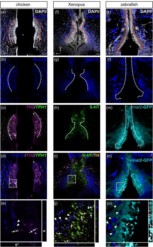 Genes referenced: elavl3 slc18a2 th th2 tph1 tph2