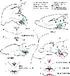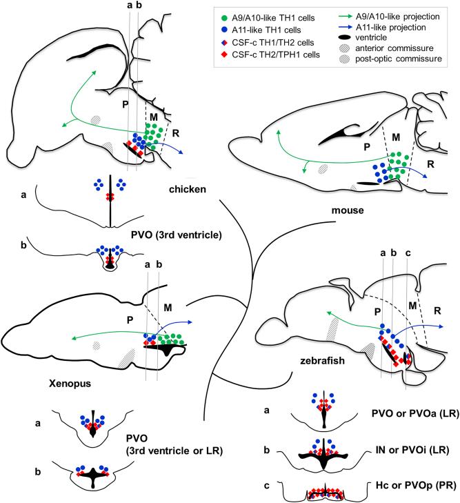Figure 12. Open in figure viewerDownload Powerpoint slide Comparison of monoaminergic cell populations in different groups of Osteichthyes. Some comparable monoaminergic cell groups are plotted on schematic drawings of brain sections of mouse, chicken, Xenopus, and zebrafish. The sagittal plane is close to the midline (rostral to the left). The diamonds represent CSF-c cells, and the circles represent non-CSF-c cells. TH2/TPH1-expressing CSF-c cells (red diamonds) are commonly found along the hypothalamic recess throughout vertebrates, while placental mammals have lost the CSF-c cells in the hypothalamic region. Below the sagittal section of chicken, Xenopus, and zebrafish, frontal sections around the hypothalamic recess (corresponding to the level of gray lines; a,b,c) are shown. In chicken and Xenopus, there is only one hypothalamic recess (named either 3rd ventricle or lateral recess; LR), while in zebrafish, there is an additional recess (posterior recess; PR). Note that in Xenopus, the caudally located CSF-c cells are not observable in the sagittal section close to the midline, because it is located at the lateral end of the LR. The A11-like TH1-expressing cell population (blue dots; non-CSF-c cells) projecting to the spinal cord is commonly found dorsolateral to the CSF-c cells in all the vertebrate groups. More caudally, the A9/10-like DA cell population projecting to the telencephalon (green dots) is found in tetrapods, while this cell population is lacking in teleosts. L = lateral recess; M = mesencephalon; P = prosencephalon; PR = posterior recess; R = rhombencephalon |