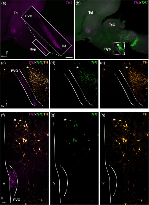 Figure 4. Localization of TH1, TH2, and TH immunoreactivity in the PVO of chicken. Representative micrographs of chicken brains in sagittal sections (a–e) and frontal sections (f–h) are shown. Abundant labeling of TH2 transcripts is found all along the hypothalamic recess (a; magenta). In the inset of (a), the expression of TH2 by PVO CSF‐c cells is shown at higher magnification. Double labeling with TH1 (green) shows that there is no overlap for the expression of the two genes in the PVO (b). Confocal images (Z projections = 10 µm) of the squared area in (b) are shown in (c–e). TH2 transcripts are localized along the PVO, in the area delimited by dashed lines (c). In contrast, TH1 is absent in the PVO (d), as are TH immunoreactive cells (e; orange). The micrograph of the frontal section (ventricular zone to the left) also shows that the PVO contains TH2 transcripts (f; magenta), but not TH1 (g; green) nor TH immunoreactive cells (h; orange). TH1 expressing cells and TH immunoreactive cells are observed dorsally to the PVO (asterisks in b–h). D = dorsal; Hyp = hypothalamus; Inf = infundibulum; L = lateral; R = rostral; Tel = telencephalon; TeO = optic tectum; v = ventricle. Scale bars = 1 mm in (a) (applies to a, b); 200 µm in (c) (applies to c, d, e); 100 µm in (f) (applies to f, g, h) |