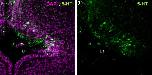 Figure 2. Open in figure viewer 5-HT+ CSF-c cells in the Xenopus PVO. The laterally extended hypothalamic recess (lateral recess; LR) is visualized with DAPI staining (magenta) from a frontal section (midline to the left). CSF-c cells immunolabeled for 5-HT (green) are located medially in the rostral hypothalamus and laterally in the caudal hypothalamus. (a) depicts both DAPI and 5-HT stainings, while (b) shows 5-HT only (same picture). In the projection of confocal images (15 µm), the rostromedial and caudolateral CSF-c cells look continuous. Scale barâ=â50 µm |