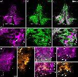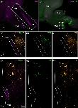 Figure 6. Open in figure viewer Localization of th1, th2, and TH immunoreactivity in the PVO of Xenopus. Confocal images obtained from a frontal section of the Xenopus PVO are shown (Z projectionsâ=â10 µm). Counterstaining with DAPI (gray) shows that th2 (magenta) is expressed in the region corresponding to PVO (a). A cell population displaying strong th1 signal (green) is found dorsolaterally to the PVO (asterisks in b), which overlaps with TH immunoreactivity (orange; asterisks in c). Higher magnification of the area delimited by a dashed square in (c) is shown in (dâf). Faint TH immunoreactivity is also found in CSF-c cells in the Xenopus PVO. TH+ labeling is observed in the soma and in the processes bathing the ventricle of CSF-contacting cells (arrowheads in dâf). A few CSF-contacting cells expressing th2 are also TH immunoreactive (arrows in dâf). Dâ=âdorsal; Lâ=âlateral. Scale barâ=â50 µm in (a) (applies to a, b, c); 100 µm in (d) (applies to d, e, f) |