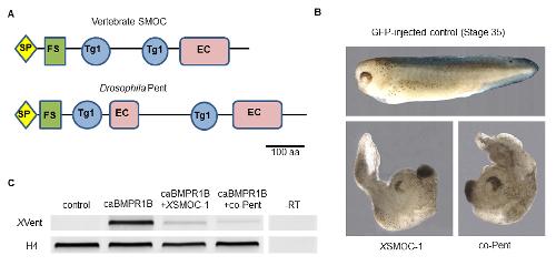 Figure 1. Download figureOpen in new tab Figure 1. Xenopus SMOC-1 and Drosophila pent are orthologues that inhibit BMP signaling downstream of the BMP receptor. (A) Schematic representation of vertebrate SMOC and Drosophila Pent: SP- signal peptide, FS â Follistatin-like domain, Tg1 â Thyroglobulin type I-like domain, EC- Extracellular calcium binding domain (B) Dorsalized phenotypes of stage 35 Xenopus embryos following overexpression of mRNAs for XSMOC-1 or codon-optimized pent (co-pent): Xenopus embryos were injected bilaterally at the two-cell stage with 200 pg of mRNA for either GFP (control), XSMOC-1, or co-pent. The exaggerated dorsal/anterior structures and diminished posterior structures observed following XSMOC-1 or co-pent overexpression were observed in 95% of embryos in four independent experiments (n = 130). (C) RT-PCR analysis of animal cap (AC) explants removed from stage 8/9 embryos injected bilaterally at the two-cell stage with either 450 pg of GFP (Control), 150 pg of constitutively active BMP receptor IB (caBMPR-IB) plus GFP (300 pg), or 150 pg of caBMPR-1B plus XSMOC-1 or co-pent (300 pg) mRNAs. The AC explants were incubated until stage 20 before RNA extraction. Induction of the BMP signaling target gene, XVent, by caBMPR-1B was blocked by co-expression of either XSMOC-1 or co-pent. âRT control, without reverse transcriptase. DOI: http://dx.doi.org/10.7554/eLife.17935.003 |