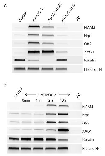 Figure 3. XSMOC-1 and XSMOC-1∆EC, but not XSMOC-1EC convert the fate of naïve Xenopus ectoderm explants (animal caps) to anterior neural tissue within two hours. (A) RT-PCR analysis of animal caps removed at stage 8/9 and incubated in 0.7X MMR/0.1% BSA (control) containing equimolar amounts of XSMOC-1 (100 μg/ml), XSMOC-1∆EC (75 μg/ml) or XSMOC-1EC (50 μg/ml) until sibling embryos reached the late neurula stage (20); anterior neural markers (N-CAM, Nrp-1, Otx2, Xag-1) were induced by both XSMOC-1 and XSMOC-1∆EC, but not by XSMOC-1EC. Expression of the ectodermal marker Keratin was suppressed by both XSMOC-1 and XSMOC-1∆EC, but not by XSMOC-1EC. (B) Animal caps removed at stage 8/9 were incubated in 0.7X MMR/0.1% BSA (control) in the presence of XSMOC-1 (100 μg/ml) for six minutes, one hour, or two hours before replacing with 0.7X MMR/0.1% BSA and incubating until sibling embryos reached stage 20. RT-PCR analysis shows that a two hour exposure to XSMOC-1was sufficient to induce the naïve ectoderm to express anterior neural markers 16 hr post-pulse; a one hour exposure was not. The continual presence of XSMOC-1 (16 hr) was used as a positive control. DOI: http://dx.doi.org/10.7554/eLife.17935.008 |