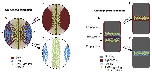 Figure 8. Schematic diagrams showing the proposed mode of action of Pent in the Drosophila wing disc and SMOC in vertebrate joint interzones. (A) Representations of the expression patterns of pent (Vuilleumier et al., 2010) dally (Fujise et al., 2003) and Dpp signaling (pMad) (Vuilleumier et al., 2010) in wild type Drosophila wing discs, compared with (B) pent−/− or (C) dally−/− mutant discs. The expression patterns observed in the absence of pent or dally (Vuilleumier et al., 2010) are consistent with Pent/Dally binding being required to expand the range of Dpp signaling. (D) Expression patterns of SMOC (Okada et al., 2011; Rainger et al., 2011), Syndecan-3 (Koyama et al., 1995), and BMP signaling (pSmad) [4949] in a developing vertebrate autopod joint, compared with that predicted for (E) the absence of HSPGs (HS−/−), or (F) the absence of SMOC (SMOC−/−). DOI: http://dx.doi.org/10.7554/eLife.17935.016 |