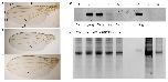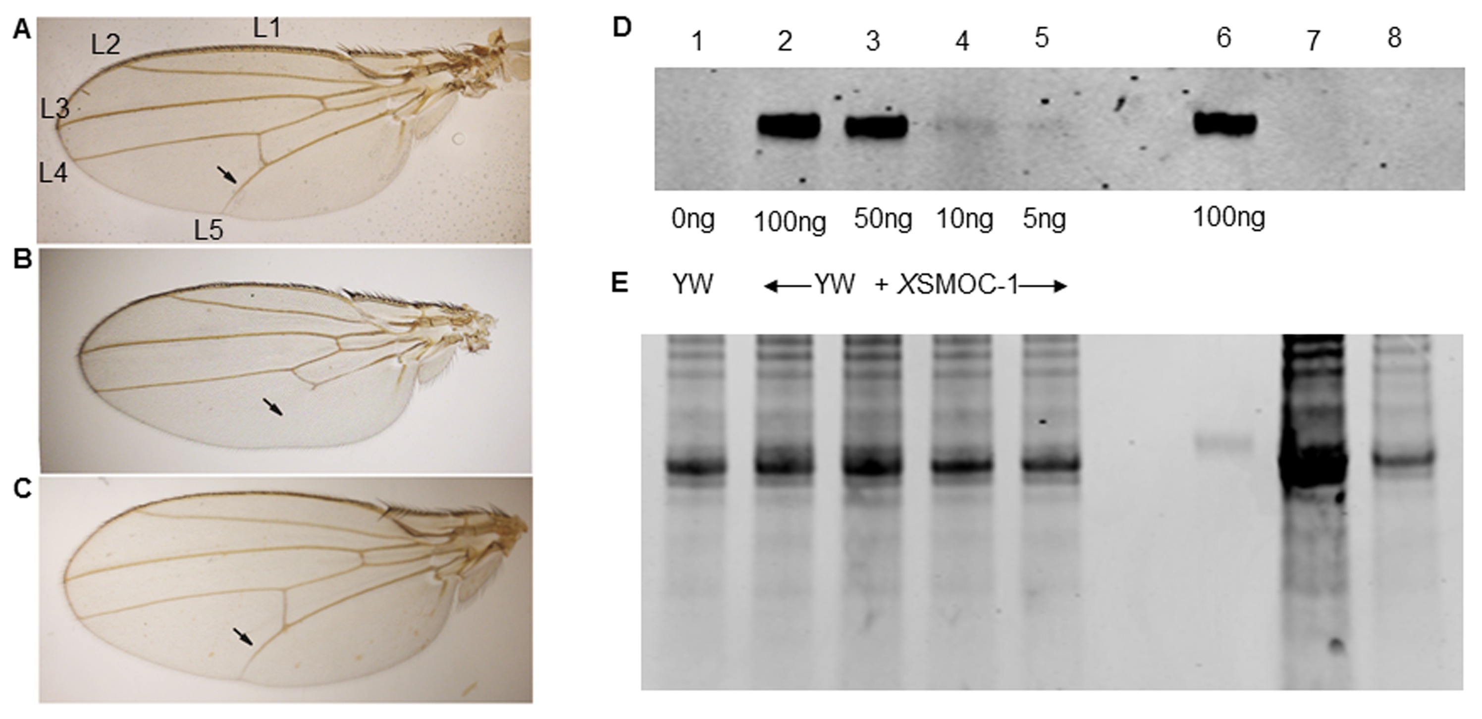 Figure 1—figure supplement 1. Pent constructs are biologically active in Drosophila, but XSMOC-1 protein is not detected in Drosophila following mRNA overexpression. (A–C) Adult Drosophila longitudinal wing vein (L1 to L5) patterns in (A) wild type; arrow indicates the position of the anterior crossvein between L4 and L5. (B) pent2-5/pentA17 mutant lacking pent where L5 is missing (C) Rescue of pent2-5/pentA17 phenotype by expression of Pent in a pent2-5/pentA17 background using the UAS/Gal4 system with brinker (brk)/Gal4 as the driver. (D) Immunoblot of Drosophila embryo extracts (10 μg/lane) from control yellow white (YW) Drosophila embryos spiked with XSMOC-1 (Lanes 1–5) as indicated, XSMOC-1 only (Lane 6), or Drosophila lines 4 (Lane 7) and 5 (Lane 8) overexpressing XSMOC-1 mRNA. (E) Coomasie-stained SDS-PAGE gel following protein transfer shown in (D), showing residual protein. The amount of protein in lane seven is notably more than that in other lanes, but the XSMOC-1 signal is nevertheless undetectable. DOI: http://dx.doi.org/10.7554/eLife.17935.004 |