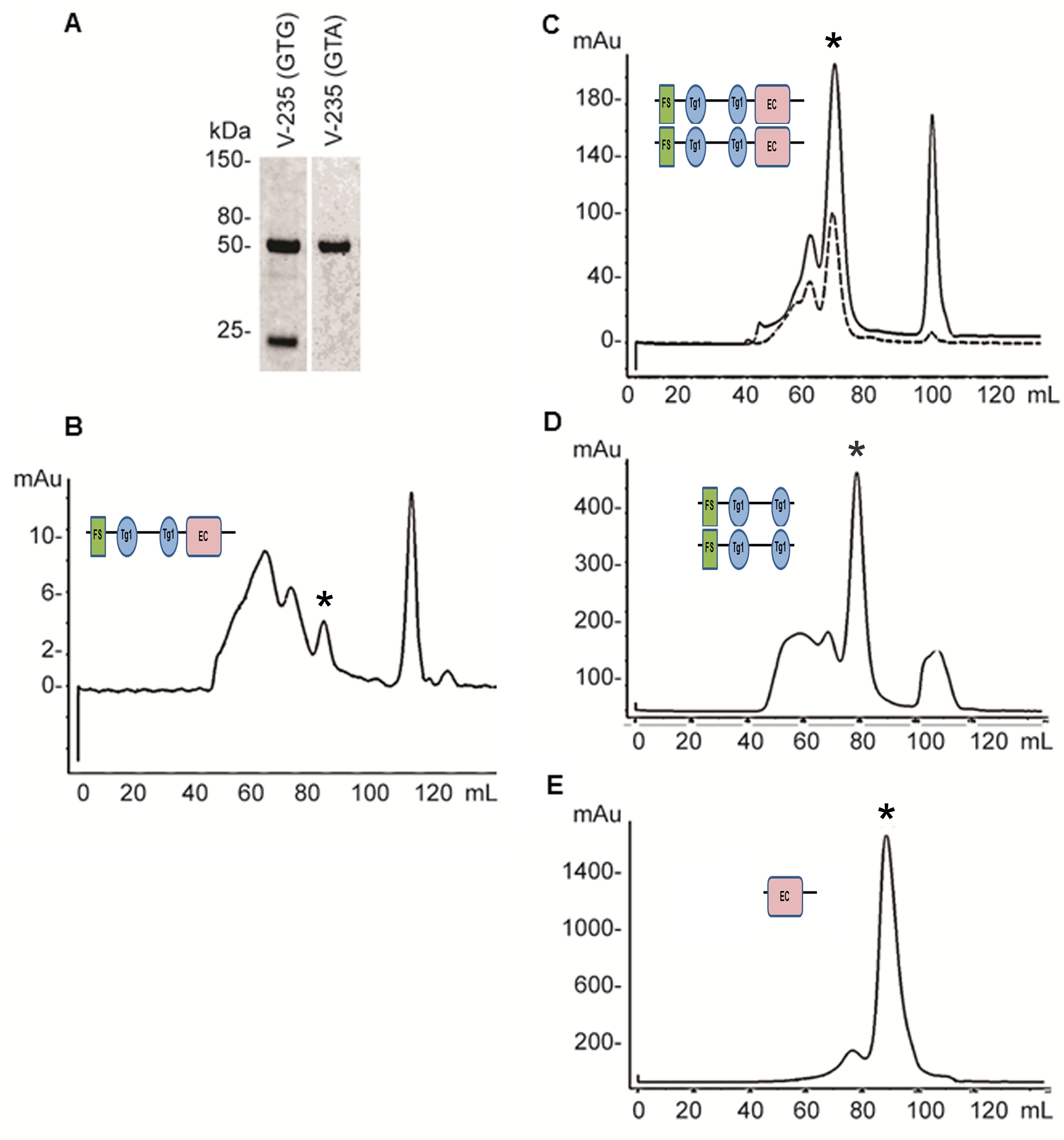 Figure 2. Expression and refolding of recombinant mature XSMOC-1, XSMOC-1∆EC, and XSMOC-1EC. (A) Coomassie stained SDS-PAGE of wild type (V235-GTG) and silent mutant (V235-GTA) recombinant mature XSMOC-1 following size exclusion chromatography (SEC). The product migrating at 24 kDa is a partial XSMOC-1 sequence beginning at the cryptic start site encoded by GTG at V235. (B–E) Solid lines: SEC profiles obtained following refolding of XSMOC-1 (B, C), XSMOC-1∆EC (D) and XSMOC-1 EC (E) either in the absence (B) or presence of 2 mM Calcium Chloride (C–E). Dashed line: SEC profile (C) obtained for human SMOC-1 refolded in the presence of calcium. Asterisk symbols indicate the peaks corresponding to each schematic diagram. DOI: http://dx.doi.org/10.7554/eLife.17935.006 |