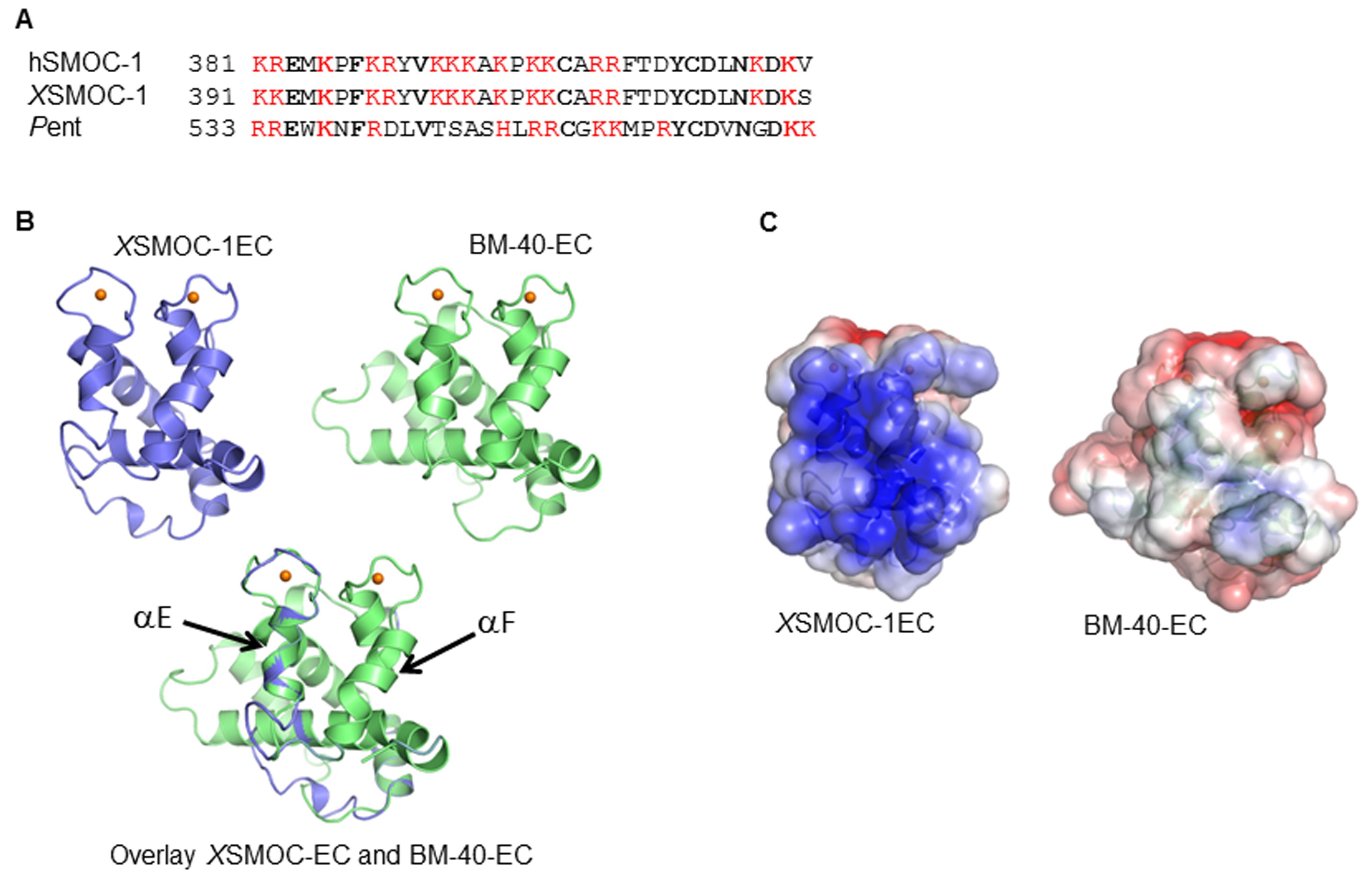 Figure 5—figure supplement 1. The EC domains of SMOC and Pent are conserved and share structural homology to BM-40. (A) Predicted heparin binding sequence of hSMOC-1 aligned with the same region of XSMOC-1 and Pent. Conserved amino acids are shown in bold and basic amino acids are shown in red. (B) Unsupervised homology model for the XSMOC-1 EC domain, based on the structure of the EC domain of BM-40 (1SRA.pdb), constructed using the Protein Homology/analogy Recognition Engine (PHYRE, RRID:SCR_010270). The XSMOC-1 EC domain aligns in the exact orientation with the BM-40 model; alpha helices E and F are noted. (C) Electrostatic surface potential maps (based on solvent accessibility) of the EC domains of XSMOC-1 and BM-40 showing an area of positive charge (shown in blue) in XSMOC-1 that is absent in the equivalent region of BM-40. DOI: http://dx.doi.org/10.7554/eLife.17935.012 |