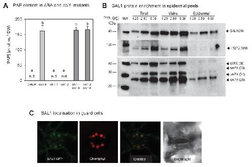 Figure 1—figure supplement 1. PAP content in single and double mutants; and SAL1 localization in epidermal peels and guard cell chloroplasts.(A) Quantification of PAP in well-watered (WW) plants shows PAP levels in double mutants (dark bars) were not significantly different to sal1-8 (light bar). Data are means ± SEM, n = 5. Significant differences (p<0.05) are indicated by a, b. n.d. = not detected. (B) Western blots of total leaf, veins and epidermal peels isolated from 51 day-old Col-0 plants showed SAL1 could be detected in epidermal peels, whereas mesophyll and bundle sheath localized proteins, PEPC and APX were barely detectable. (C) Leaves of adult plants expressing pSAL1:SAL1:GFP examined using a Leica confocal microscope showed GFP fluorescence in the chloroplasts of guard cells.DOI: http://dx.doi.org/10.7554/eLife.23361.003 |