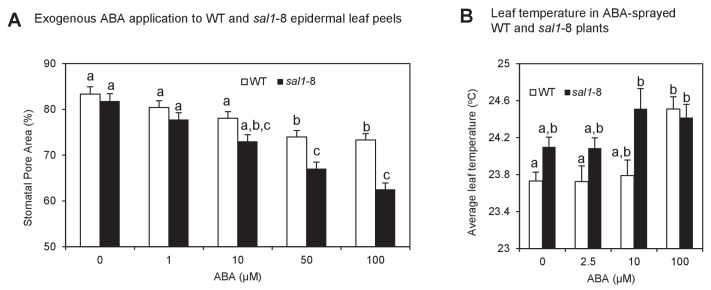 Figure 1—figure supplement 2. Enhanced ABA sensitivity in guard cells of sal1-8.(A) Stomatal aperture, calculated using measurements of pore width and length, in leaf peels of wild type and sal1-8 plants treated with 0, 1, 10, 50 and 100 µM for 1 hr. Values are means, expressed as a percentage compared to time 0, of 12–16 stomata ± SEM. Significant differences between genotypes and treatments are shown by a,b,c (2-way ANOVA and Tukey’s HSD, p<0.05). (B) Thermography of 35-day old wild type and sal1-8 intact plants sprayed with 0, 2.5, 10 or 100 µM ABA. Mean and SEM of leaf temperature from four individual plants per genotype are shown. Plants were returned to growth chamber and temperature measured after 2 hr. Significant differences between genotypes are treatments are shown by a,b (2-way ANOVA and Tukey’s HSD, p<0.05).DOI: http://dx.doi.org/10.7554/eLife.23361.004 |