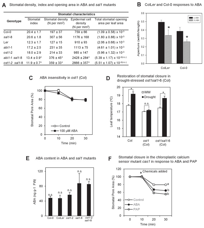 Figure 1—figure supplement 3. The biochemistry, physiology and stomatal features of single and double mutants, and testing of PAP action via pathogen signaling.(A) Stomata density, epidermal cell density, stomatal index and total stomatal opening area per leaf area from CryoSEM images of abaxial surface of leaves of six week-old plants. Stomatal index is calculated according to the equation: Stomatal index = [(stomatal density) / (stomatal density + epidermal cell density)]*100. Calculations were performed from five different fields of view per leaf per genotype, n > 30. The experiments were performed twice with similar results. Significant differences at p<0.05 (*) or no significant difference (n.s.) are shown for abi1-1 sal1-8 to abi1-1 and ost1-2 sal1-8 to ost1-2, respectively. (B) Effect of ABA on the stomatal aperture of Col-0 vs ColLer hybrid of leaf peels from five- to six-week old plants after 2 hr of 50 µM ABA. (C) Effect of ABA on the stomatal aperture of ost1 (Col-0) treated with either mock control buffer or 100 µM ABA for 30 min. Results are mean ± SE of 15 stomata per treatment. (D) Stomatal closure, as assayed by leaf temperature using infrared thermography, in well-watered and drought-stressed WT, ost1 and ost1sal1-6 (all in Col-0 background). Values are mean ± SE of five individual plants per genotype. Significant differences are shown for p<0.05 (*). (E) Effect of the sal1-8 mutation on total leaf ABA content. The ABA content in sal1-8 and ost1-2 sal1-8 were marginally higher but not statistically different to ColLer or ost1-2 (ANOVA, p=0.09). Results are means and standard error of 3 × 100 mg pooled two-week old seedlings. (F) Stomatal closure in leaf peels of the chloroplastic calcium sensor mutant, cas1, after treatment with 100 µM ABA, 100 µM PAP or control measuring buffer (Means ± SEM of >40 stomata per genotype). Significant differences at t = 30 min (a, b; p<0.05) are shown.DOI: http://dx.doi.org/10.7554/eLife.23361.005 |