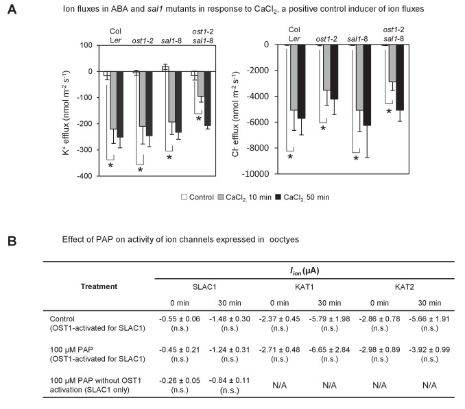 Figure 3—figure supplement 1. Effect of endogenously accumulated and exogenous PAP on ion fluxes in guard cells and transporter activity in oocytes respectively.(A) Changes in ion fluxes (K+, Cl−) in genotypes treated with CaCl2, a known secondary messenger and inducer of stomatal closure downstream of ABA, transcription, NO and ROS. Bars denote means of at least five plants ± SEM. Asterisk indicates statistically significant difference to 0 min (p<0.05, ANOVA) (B) Effect of 100 µM PAP on the activity of the chloride ion channel SLAC1 and potassium ion channels KAT1 and KAT2 expressed in Xenopus oocytes. Steady-state ion channel currents were measured at −110 mV for SLAC1 and −150 mV for KAT1 and KAT2 (see Materials and methods for voltage clamp protocols and measuring conditions). ‘OST1-activated for SLAC1’ treatments refer to oocytes co-injected by both SLAC1 and OST1 cRNA to allow expression of both proteins and for phosphorylation of SLAC1 by OST1, which activates SLAC1 activity. Means and SE of three to four biological replicates per treatment and ion channel are shown.DOI: http://dx.doi.org/10.7554/eLife.23361.009 |