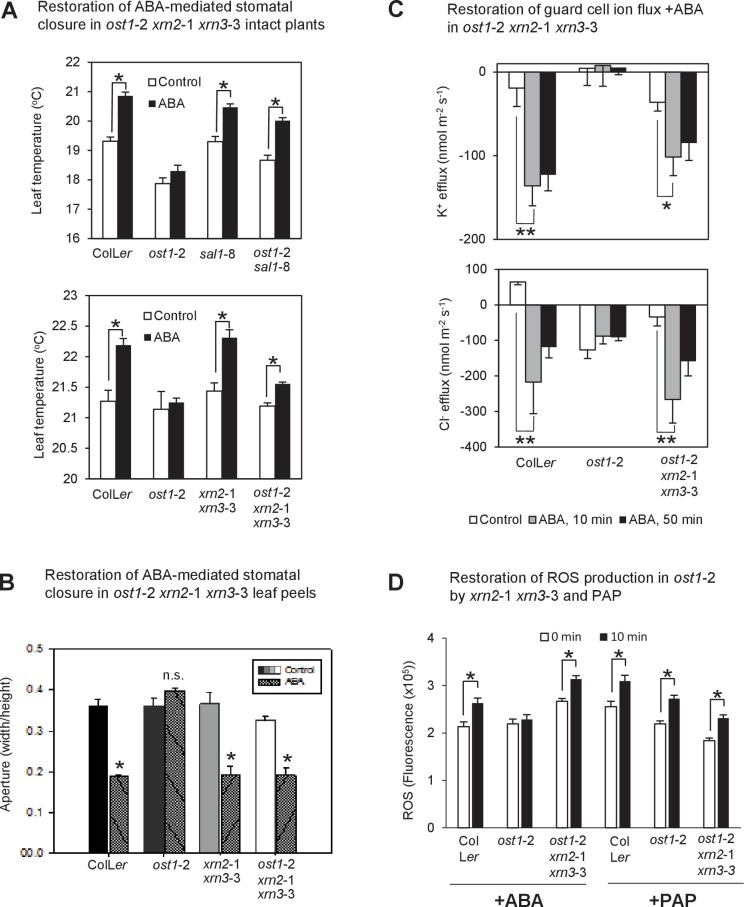 Figure 4. Restoration of ABA-responsive stomatal closure, guard cell ion fluxes and ROS production in ost1-2 xrn2-1 xrn3-3.(A) Leaf temperature, a proxy of stomatal closure, in leaves of intact plants of wild type, ost1-2, sal1-8, ost1-2 sal1-8, xrn2-1 xrn3-3 and ost1-2 xrn2-1 xrn3-3 after treatment with 20 µM ABA for 2 hr. Significant differences relative to control are indicated by asterisk (*p<0.05). Values shown are means ± SEM of 3–9 biological replicates per treatment. The ABA responses of ost1-2 sal1-8 and associated controls were performed in an earlier, independent experiment compared to ost1-2 xrn2-1 xrn3-3. (B) Stomatal aperture in leaf peels of wild type, ost1-2, xrn2-1 xrn3-3 and ost1-2 xrn2-1 xrn3-3 after treatment with 50 µM ABA for 2 hr (40–60 stomata per genotype ± SD). Significant difference (*) at p<0.05 is shown for +ABA. The same trend was observed in two independent experiments. (C) Effects of 500 µM ABA on combined net flux of each of the ion transporters for K+ and Cl− from guard cells in leaf epidermal peels of four-week old Arabidopsis plants. Average net ion fluxes ± SEM (n = 4–12 plants) are shown for control, 10 min and 50 min after ABA treatment. Significant differences are indicated by asterisks (*p<0.05, **p<0.01; ANOVA) (D) Mean corrected total cell fluorescence of ROS in the presence of 2’,7’-dichlorodihydrofluorescein diacetate (H2DCFDA), a ROS probe that detects primarily H2O2 and to a lesser extent hydroxyl radicals (Wojtala et al., 2014), in guard cells before and after 10 min of 100 µM ABA or 100 µM PAP. Means ± SEM of 110–190 (+ABA) or 130–200 (+PAP) stomata from four biological replicates per genotype are shown with significant differences denoted (t-test, p<0.05).DOI: http://dx.doi.org/10.7554/eLife.23361.011 |