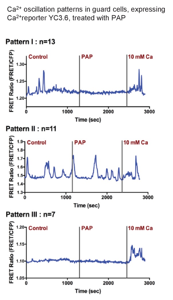 Figure 6. Exogenous PAP does not stimulate cytosolic Ca2+ transients in guard cells.Three representative Ca2+ oscillation patterns obtained from time-resolved Ca2+ imaging experiments with PAP treatment. Numbers of observed cells in each group are labeled above each graph (measurements were obtained from 10 different plants). Guard cells of YC3.6 plants were monitored for their FRET emission at 535 nm and 480 nm. FRET ratio increases after the addition of 10 mM Ca2+ suggesting the cells are capable of sensing intracellular Ca2+ level changes.DOI: http://dx.doi.org/10.7554/eLife.23361.014 |