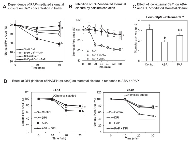 Figure 7. Interaction between PAP-mediated signaling with Ca2+.(A) Wild type stomatal aperture with or without PAP in the presence of low (50 µM) Ca2+ or high (1 mM) Ca2+ in the measuring buffer. Means ± SEM for 9â10 stomata per treatment are shown. Significant differences between treatments at t = 60 min (ANOVA, p<0.05) are indicated by a, b. (B) Stomatal aperture in leaf peels treated with PAP and an intracellular calcium chelator (BAPTA-AM) or an extracellular calcium chelator (EGTA).Values are relative to control (measuring buffer). Means ± SEM for 18 stomata from four plants per treatment are shown. Significant differences between treatments at t = 60 min (ANOVA, p<0.05) are indicated by a, b. (C) Stomatal aperture in leaf peels treated with control (ethanol), 100 µM PAP or 10 µM ABA in the presence of low Ca2+ (50 µM). Means and SEM for four plants with >28 stomata per plant are shown. Significant differences between treatments (ANOVA, p<0.05) are indicated by a, b. (D) Stomatal aperture in leaf peels that were pretreated with 20 µM diphenyleneiodonium (DPI) prior to treatment with either 100 µM PAP or 100 µM ABA, in measuring buffer. The control treatment was leaf peels which were not pretreated with DPI and were treated with measuring buffer. Values are means ± SEM for 41â51 stomata per treatment. Final level of closure was considered by ANOVA after treatment; significant difference (p<0.05) denoted a, b.DOI: http://dx.doi.org/10.7554/eLife.23361.015 |