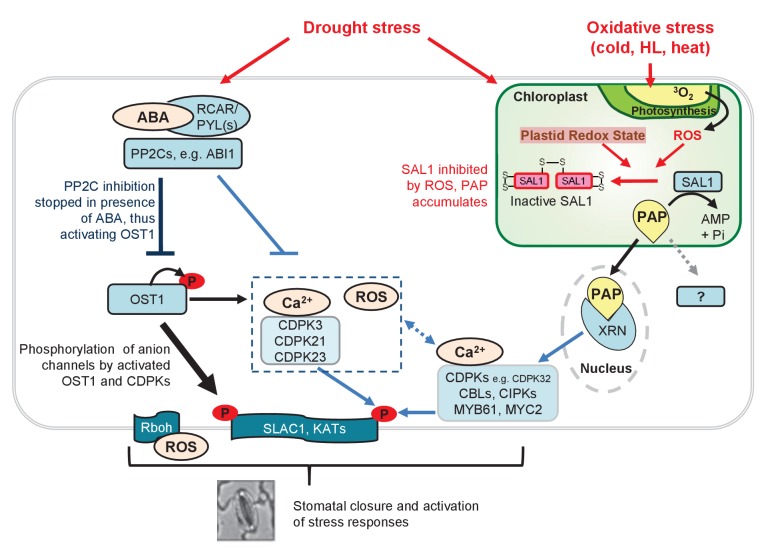 Figure 9. Model for fine-tuning of stomatal closure by PAP retrograde signaling.Proposed intersection between PAP and ABA signaling during drought stress, or in ost1-2 sal1-8 / abi1-1 sal1-8 treated with ABA. Binding of ABA to its receptors (PYR/PYLs) inactivates the inhibitory PP2Cs, thus allowing activation of OST1 for phosphorylation of proteins such as transcription factors and SLAC1. This is the major pathway for stomatal closure. Additionally, ABA signaling results in Ca2+ release which could activate multiple Ca2+ signaling proteins including CDPKs and CBLs/CIPKs thus allowing phosphorylation and activation of SLAC1. Many of these ABA and Ca2+ signaling proteins can be regulated by PAP predominantly via PAP-XRN-mediated retrograde signaling. The CDPK activation of SLAC1 can occur in parallel with Ca2+-independent OST1, allowing a convergence between chloroplast and ABA signaling at this key anion channel for stomatal closure. It is possible that PAP can also regulate stomatal closure through other proteins, though there is as yet no evidence for this in plants. The relative contributions of each pathway towards control of stomatal closure are indicated by the thickness of the arrows and lines. Solid lines and arrows indicate characterized pathways. Signaling pathways which have not been fully studied are indicated with dashed lines and ‘?'.DOI: http://dx.doi.org/10.7554/eLife.23361.018 |