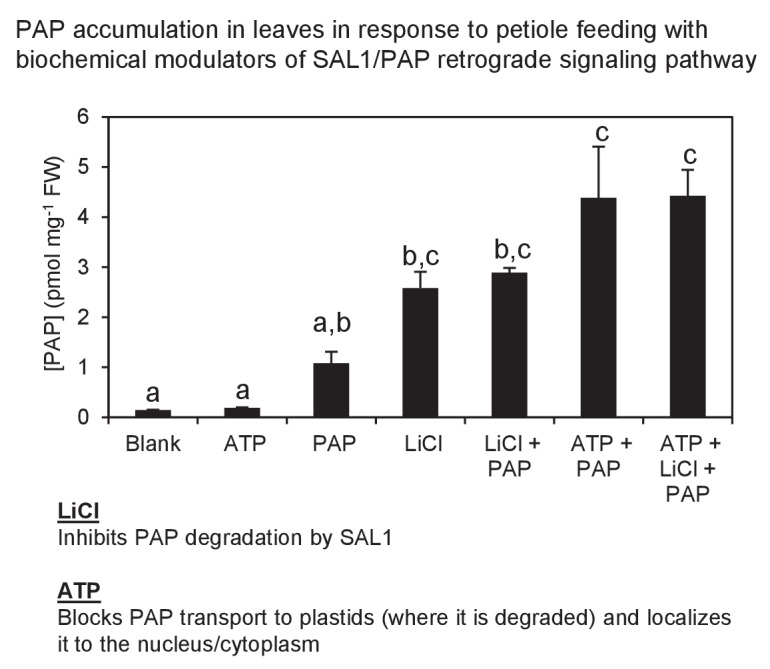 Figure 2—figure supplement 1. Exogenous PAP feeding to plant leaves via epidermal leaf peels or petiole feeding.Petiole feeding of PAP for 1 hr results in accumulation of PAP in leaves. Levels were significantly enhanced by co-application with LiCl, an inhibitor of the PAP catabolic enzyme SAL1, or with ATP, which outcompetes PAP for transport into plastids where PAP is degraded. ATP also allows PAP to be localized to its sites of action, the nucleus/cytoplasm. Results averaged from three individual plants ± SEM. a, b and c represent significant differences (p<0.05).DOI: http://dx.doi.org/10.7554/eLife.23361.007 |