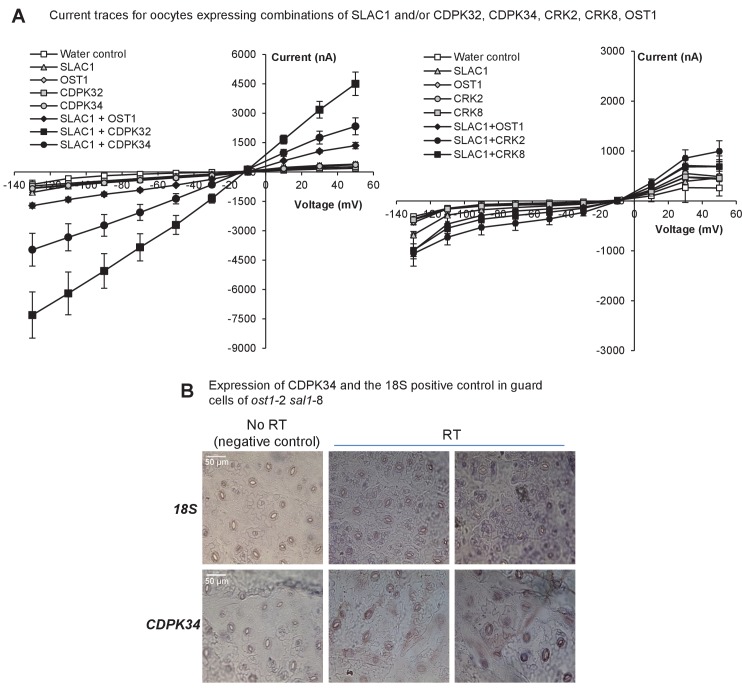 Figure 5—figure supplement 1. Expression and activity of CDPKs up-regulated by PAP.(A) Representative current trace data of SLAC1 anion activation by different kinases in Xenopus laevis oocytes at voltage pulses ranging from +50 to −130 mV in 20 mV decrements. Values are means of three to five oocytes ± SEM. (B) Representative images for expression of CDPK34 and the housekeeper 18S in guard cells of ost1-2 sal1-8, as detected by in situ PCR on leaf peels. Staining for cDNA of CDPK34 and 18S ribosomal RNA showed a diffuse blue pattern across both pavement and guard cells. In guard cells the staining was evenly blue or punctate, consistent with CDPK34 expression. The negative control (‘no RT’) slides showed only large precipitates or no staining as expected. The ‘no RT’ negative controls refer to leaf peels in which the reverse transcription of mRNA was omitted, thus any staining in these slides occur by non-specific binding or precipitation of the stain. Similar results were observed in at least two biological replicates per mRNA.DOI: http://dx.doi.org/10.7554/eLife.23361.013 |