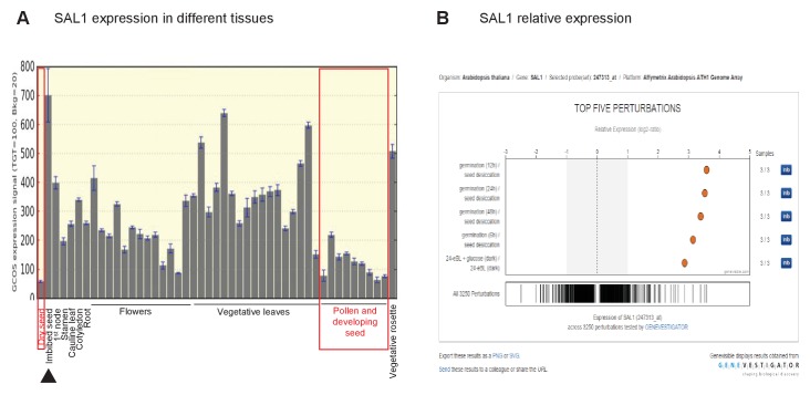 Figure 8—figure supplement 1. Role of SAL1 and PAP in regulating seed germination.Wild type seed differentially regulates SAL1 transcript and protein abundance to accumulate more PAP than leaves. (A) SAL1 expression is the lowest during seed development and in dry seed (red boxes), and highest when the seed is imbibed (black arrow). Data visualized from publically-deposited microarray data using eFP Browser. (B) Analysis of publically-deposited microarray data in Genevestigator using the Genevisible tool reveals that the top four environmental changes that exert the highest degree of change in SAL1 transcript abundance, out of >3000 perturbations, are the transition from dry seed to germinating seed. This suggests that the transcriptional repression of SAL1 and the associated PAP accumulation in seed are key aspects of seed development and dormancy.DOI: http://dx.doi.org/10.7554/eLife.23361.017 |