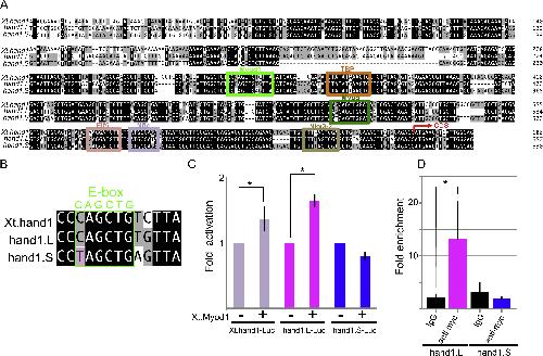 Divergence of enhancer activity between hand1.L and hand.S promoters. (A-B) Alignment of the hand1 promoter element (CNE) and potential transcription factor-binding motifs (A) and higher magnification image of potential Myod1-binding motifs. (C) Transcriptional activation of the hand1.L promoter by Myod1. Firefly luciferase activity was measured and normalized to Renilla luciferase using the dual luciferase assay kit. Luciferase data are expressed as fold activation relative to the empty expression vector. Error bars indicate ±SD, and an asterisk indicates p-value (P<0.05, n=3, two-tailed Student's T-test). (C) Myod1 protein enriched on hand1.L promoter compared with hand1.S promoter. Error bars indicate ±SD, and an asterisk indicates p-value (P<0.05, determined by one-way ANOVA with Tukey's multiple comparison test).