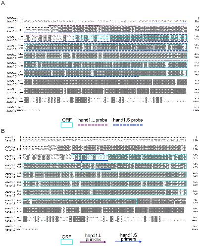 Supplementary materialSupplementary Fig 1. Target sequences of hand1 for in situ hybridization and RT-PCR. The aligned nucleotide sequences of hand1. L and hand1.S. The coding sequences are indicated by the light blue boxes, and the target sequences for L and S are indicated by the dotted purple line and dotted blue line, respectively (A). Arrows indicate the location of RT-PCR primers (B).