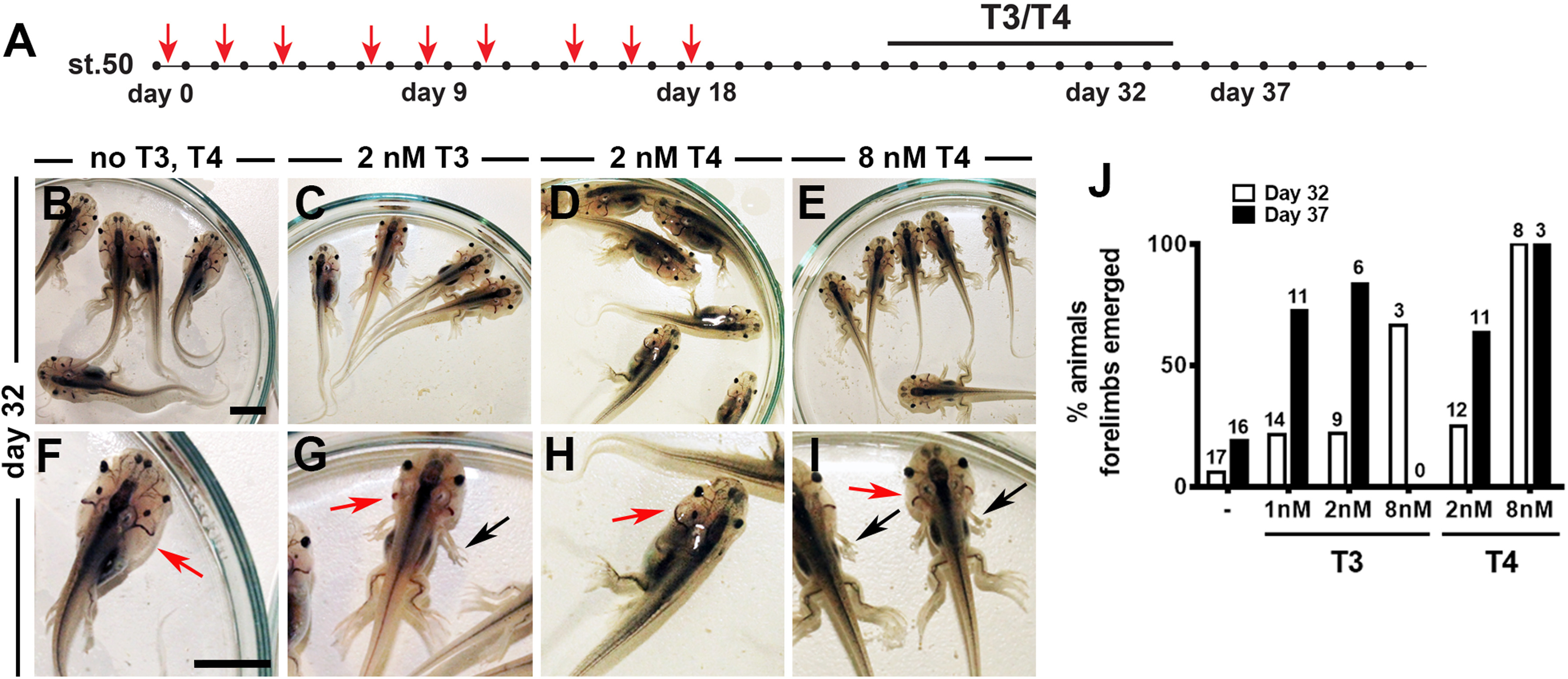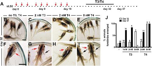 Exogenous TH rescues the effects of Lin28a during metamorphosis. (A) Experimental design. Red arrows indicate time of HS. Representative images of animals incubated with (B, F) buffer, (C, G) 2 nM T3; (D, H) 2 nM T4 or (E, I) 8 nM T4. Panels F-I show a magnification of panels B-E (black arrows indicate the emergence of forelimbs and red arrows indicate the gills). Bar, 1 cm. (J) Percentage of animals showing emergence of forelimbs (st.58 or higher) at day 32 and day 37 compared to the total number of live animals for each condition (numbers above bars). Plot corresponds to 3 independent experiments. |