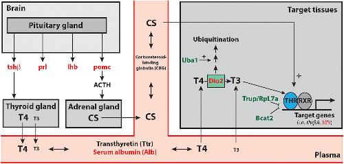 Lin28 regulates TH function. Summary of the pituitary-thyroid gland axis indicating all the components that were up-regulated (in green) or downregulated (in red) after Lin28a overexpression. |