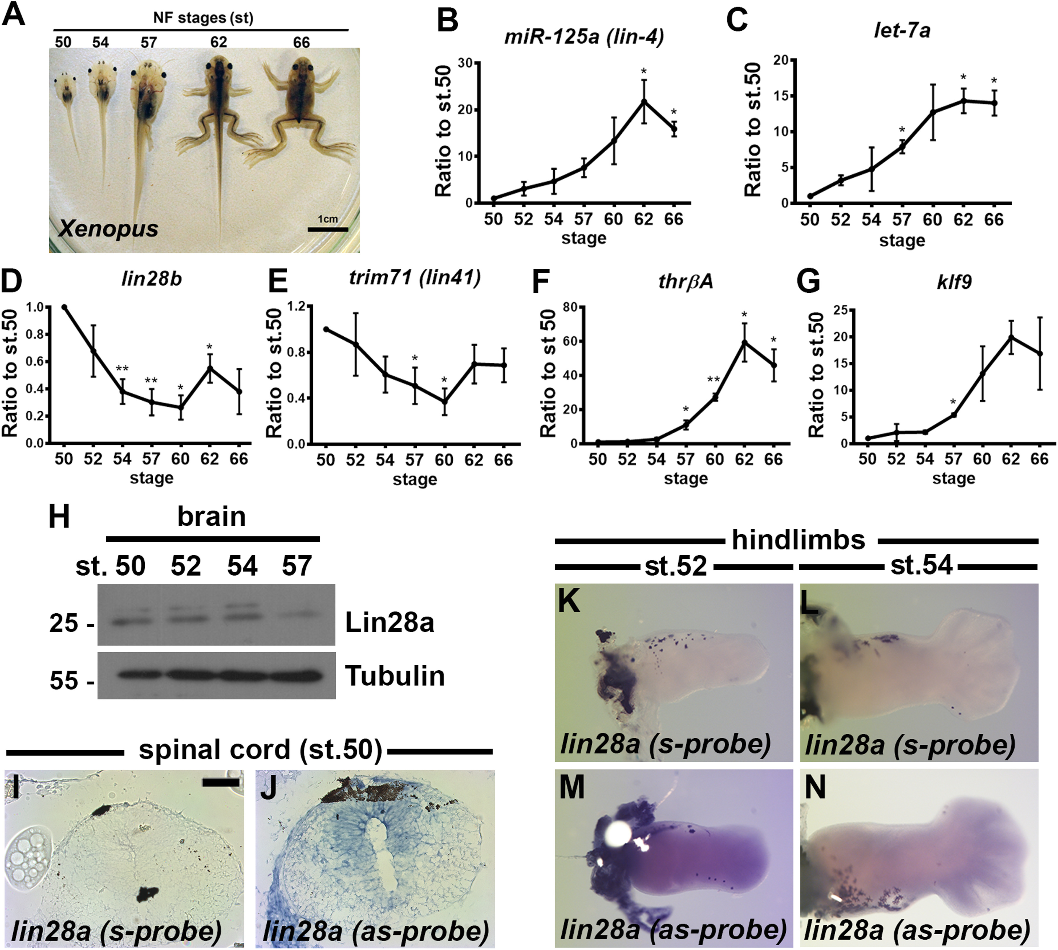 Heterochronic genes are expressed during Xenopus metamorphosis. (A) Xenopus laevis Nieuwkoop-Faber (NF) stages at pre-metamorphosis (st.50), pro-metamorphosis (st.54â57) and climax of metamorphosis (st.58â66). Bar, 1 cm. (B-G) RT-qPCR from spinal cords isolated during metamorphosis for (B) miR-125 (lin-4 orthologue), (C) let-7a, (D) lin28b, (E) trim71 (lin-41 orthologue), (F) thrβA and (G) klf9. RNA levels were normalized to 5S (B, C) and eef1αâ1 (D-G) and compared to st.50 (average ±SEM, n=2â5 independent experiments). * p<0.05, ** p<0.01, t-test against hypothetical value =1 (no change compared to st.50). (H) Western blot analysis for Lin28a in brain samples. Tubulin was used as loading control. (I-N) in situ hybridization for lin28a in (I,J) spinal cord cryosections of st.50 animals using (I) sense (s) or (J) antisense (as) probes and (K-N) limbs at st.52 and st.54 using (K,L) sense (s) or (M,N) antisense (as) probes. Bar, 50 µm.