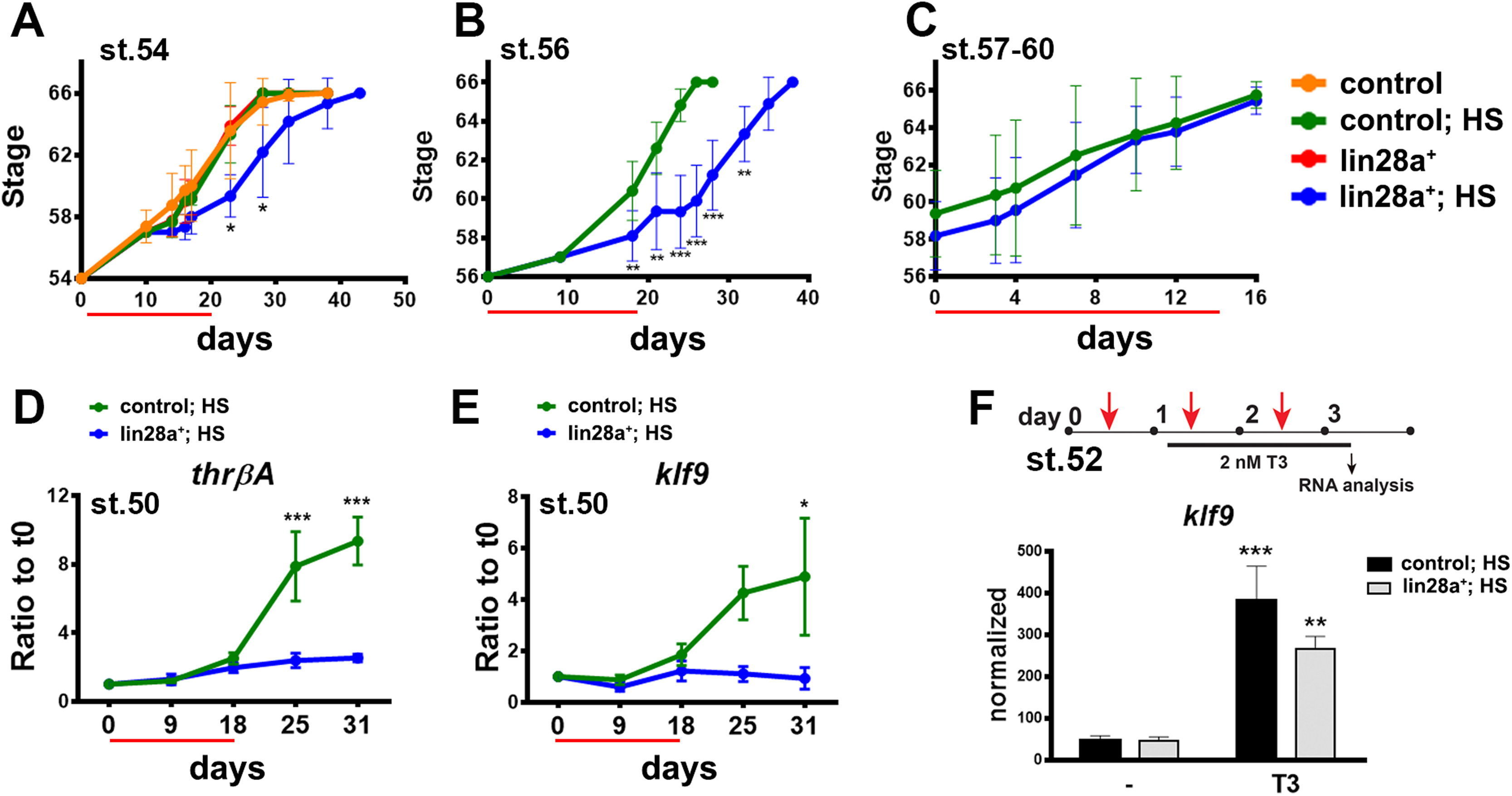 Lin28 functions upstream or in parallel to the thyroid hormone. (A-C) Control and lin28a+ animals received HS starting at (A) st.54, (B) st.56 or (C) st.57â60. Red bar indicates days of HS treatment. ANOVA plus Tukey´s multiple comparison for each day (A). *significant difference between lin28a+; HS and the other conditions simultaneously with no significant difference for the other comparisons. t-test for each day (B,C). **p<0.01, ***p<0.001. (D and E) RT-qPCR for (D) thrβA and (E) klf9 from brain samples isolated from control and lin28a+ animals with HS from day 0 to day 18 starting at stage 50. Expression was normalized to eef1αâ1 and compared to day 0 (average ±SEM, n=3 independent experiments). *p<0.05, ***p<0.001, Two-way ANOVA plus Sidak´s multiple comparisons test. (F) St.52 control and lin28a+ animals were HS for two days and incubated without or with 2 nM T3 from day 1 to day 3. Brain RNA and RT-qPCR was performed for klf9. Expression was normalized to eef1αâ1 (average ±SEM, n=4 independent experiments). **p<0.01, ***p<0.001, Two-way ANOVA plus Sidak´s multiple comparisons test for animals treated or non-treated with T3 .