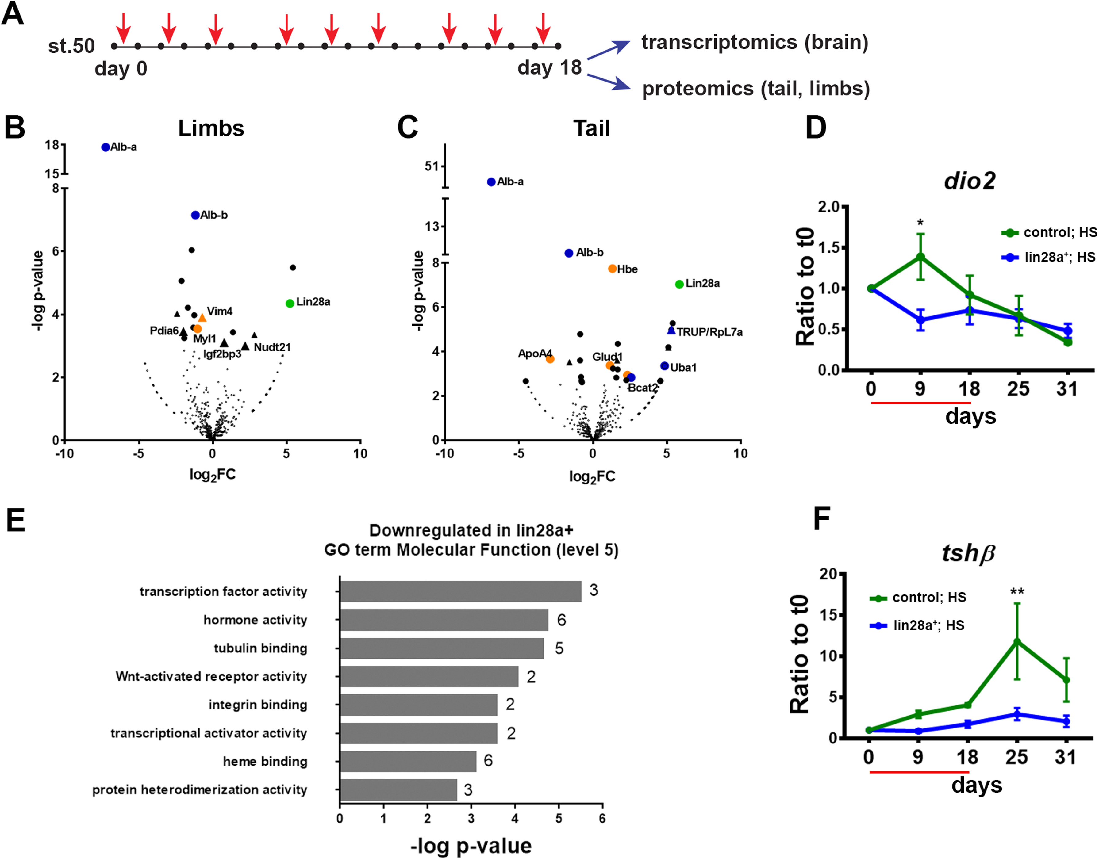 Lin28a overexpression changes the expression levels of components of the pituitary-thyroid gland axis. (A) Diagram of the experimental design for the proteomic and transcriptomic analyses. Red arrows indicate time of HS. (B and C) Volcano plots (-log10 p-value versus log2 Fold-change (FC)) for the comparison between lin28a+; HS versus control; HS for proteins found in (B) limbs and (C) tail. Proteins with differential expression (p-value <0.05 and False Discovery Rate (FDR) <0.05) are colored. Blue: components of TH transport or signaling. Orange: proteins known to be regulated during metamorphosis or by TH. Triangles: proteins whose mRNAs are known to be bound to Lin28 in CLIP-seq experiments. (D) RT-qPCR for dio2 from brain samples isolated from control and lin28a+ animals with HS. Expression was normalized to eef1a-1 and to day 0 (average ±SEM, n=3 independent experiments). *p<0.05, Two-way ANOVA plus Sidak´s multiple comparisons test. (E) Enriched categories of downregulated genes by Lin28a overexpression in Molecular Function. The number of genes in each category is indicated. (F) RT-qPCR for tshβ from brain samples isolated from control and lin28a+ animals with heat-shock. Expression was normalized to eef1αâ1 and to day 0 (average ±SEM, n=3 independent experiments). *p<0.05, Two-way ANOVA plus Sidak´s multiple comparisons test.