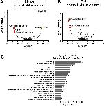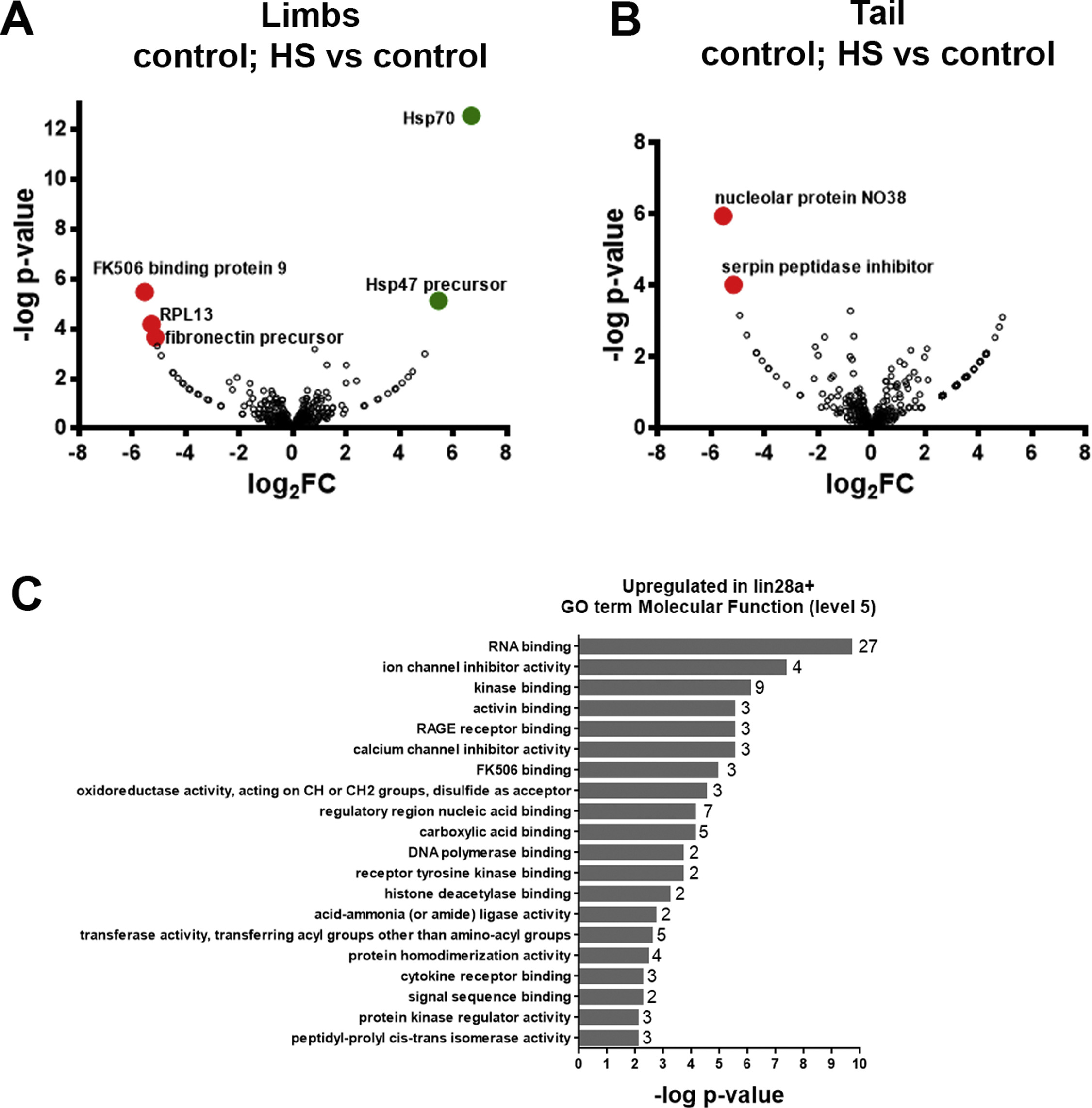 Supplementary material. Effect of Lin28a overexpression on proteins levels and enrichment of gene ontology categories. (A,B) Volcano plots (-log10 p-value versus log2 Fold-change (FC)) for the comparison between control animals without heat-shock versus control animals with heat-shock of proteins found in (A) limbs and (B) tail. Proteins with differential expression (p-value <0.05 and False Discovery Rate (FDR) <0.05) are colored. Heat-shock proteins 70 and 47 are colored in green in limbs. (C) Enriched categories of upregulated genes by Lin28 overexpression in Molecular Function. The number of genes in each category is indicated in the bar. |