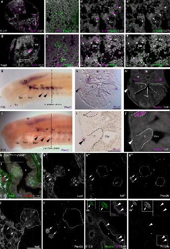 Figure 4. Putative lamprey NECs are not neural crest-derived.(a) Schematic larval lamprey section (modified from Barreiro-Iglesias et al., 2009) showing gill pairs in the orobranchial cavity, supported by an interbranchial septum, and a single gill at higher power. (b) Schematic Piavis-stage 17 (E19) lamprey (modified from Tahara,1988). Dotted line shows section plane in c,d,i,j,n. (c) Hematoxylin and eosin staining at E19 shows internal gills as âstalksâ within the orobranchial cavity. (d) Putative NECs (serotonergic cells associated with HNK1 epitope-immunoreactive neurites) are first visible at E18.5 in the medial gill epithelium. (e) Schematic (modified from Tahara,1988) showing neural crest labelling by DiI injection at E5 (Piavis stages 11â12). (fân) Two different embryos (fâj, kân), showing DiI-labeled neural crest cells migrating ventrally (arrowheads, g,l) into the branchial arches, contributing to branchial arch basket and gill supporting cells (arrowheads, j,n), but not serotonergic cells (putative NECs) in the orobranchial epithelium (i,j) or gills (n). 5-HT, serotonin; Ba, branchial arch; Bab, branchial arch basket; En, endostyle; Gs, gill seam; Is, interbranchial septum; Nc, notochord; Nt, neural tube; Obc, orobranchial cavity. Scale-bar: 50 μm.DOI: http://dx.doi.org/10.7554/eLife.21231.010Figure 4âfigure supplement 1. Confirmation of successful targeting of pharyngeal arch-destined neural crest cells in all lamprey embryos analyzed for neural crest contribution to putative NECs.For orientation, the first three panels are repeated from Figure 4. (a) Schematic larval lamprey section (modified from Barreiro-Iglesias et al., 2009) showing gill pairs in the orobranchial cavity, supported byan interbranchial septum. (b) Schematic Piavis-stage 17 (E19) lamprey (modified from Tahara,1988). Dotted line: section plane. (c) Hematoxylin and eosin staining shows internal gills as âstalksâ within the orobranchial cavity. (dâv) Each row shows one of the 19 lamprey embryos with DiI-labeled neural crest derivatives near serotonergic putative NECs at the final analysis. The first panel shows the site of DiI injection at one day post-injection (dpi) (missing for embryo Pm19); the second and third panels show DiI-labeled neural crest cells in the branchial arches in right and/or left-side views at 9-dpi; the fourth panel shows a view of the internal gills in section at 13-dpi (for section plane, see dotted line in panel a), showing DiI contribution to gill support cells, but not to the putative NECs (serotonergic cells) in the gill epithelium. Asterisks indicate the embryos from which data are shown in Figure 4 (Pm12 and Pm17). 5-HT, serotonin; En, endostyle; Gs, gill seam; Is, interbranchial septum; Nc, notochord; Obc, orobranchial cavity.DOI: http://dx.doi.org/10.7554/eLife.21231.011 |