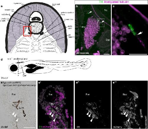 Figure 7. Catecholaminergic cells associated with gill arch blood vessels are neural crest-derived in zebrafish.(a) Schematic transverse section through ammocoete-stage lamprey gill arch (modified from Ruppert et al., 2003). Red box indicates region shown in b. (b,c) Tyrosine hydroxylase-positive (catecholaminergic) cells are present in the wall of the anterior cardinal vein (arrowheads), closely associated with acetylated tubulin-immunoreactive neurites (arrow). (d) Schematic 25-dpf zebrafish. Dotted line indicates transverse section plane through the gill basket in e-e’’’. (e–e’’’) Tyrosine hydroxylase-positive (catecholaminergic) cells (arrowheads) seen adjacent to melanocyte-covered gill-filament blood vessels (dotted lines), are neural crest-derived (mCherry-positive) in 25-dpf Tg(crestin:creERT2);Tg(-3.5ubi:loxP-GFP-loxP-mCherry) zebrafish. Acv, anterior cardinal vein; Bac, branchial arch cartilage; Bv, blood vessel; Nc, notochord; TH; tyrosine hydroxylase. Scale-bars: 50 μm in b; 25 μm in c,e.DOI: http://dx.doi.org/10.7554/eLife.21231.015 |