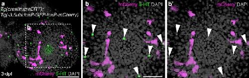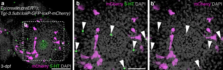 Figure 2—figure supplement 1. Putative NECs in the skin of embryonic zebrafish are not neural crest-derived.(a–b’) Three-dimensional rendering of the eye of a 3-dpf Tg(crestin:creERT2);Tg(-3.5ubi:loxP-GFP-loxP-mCherry) embryo, immunostained in whole-mount for serotonin and mCherry. Serotonergic cells are scattered in the epidermis over the eye, as reported (Coccimiglio and Jonz, 2012), but none is mCherry-positive, i.e., neural crest-derived (arrowheads). For associated z-stack movies, see Videos 1 and 2. Scale-bars: 100 μm in a; 50 μm in b.DOI: http://dx.doi.org/10.7554/eLife.21231.006 |