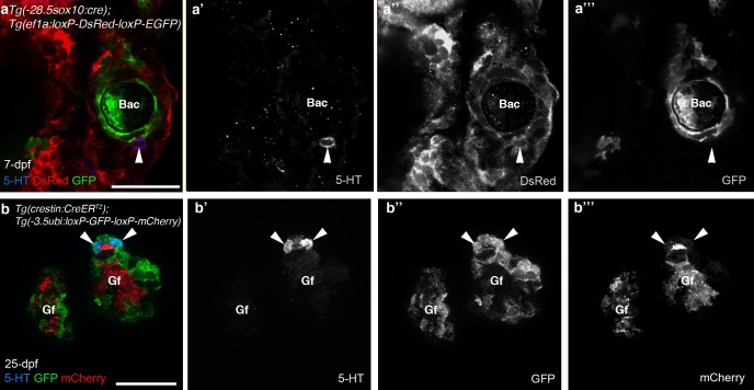 Figure 1—figure supplement 1. The promoters driving the Cre-switchable reporter cassettes are active in NECs.In 7-dpf Tg(-28.5sox10:cre);Tg(ef1a:loxP-DsRed-loxP-EGFP) (a–a’’’) and 25-dpf Tg(crestin:creERT2);Tg(-3.5ubi:loxP-GFP-loxP-mCherry) (b–b’’’) zebrafish, NECs in the gill filaments (identified by immunoreactivity for serotonin, 5-HT; arrowheads) express the un-switched reporter gene. 5-HT, serotonin; Bac, branchial arch cartilage; Gf, gill filament. Scale-bar: 25 μm.DOI: http://dx.doi.org/10.7554/eLife.21231.004 |