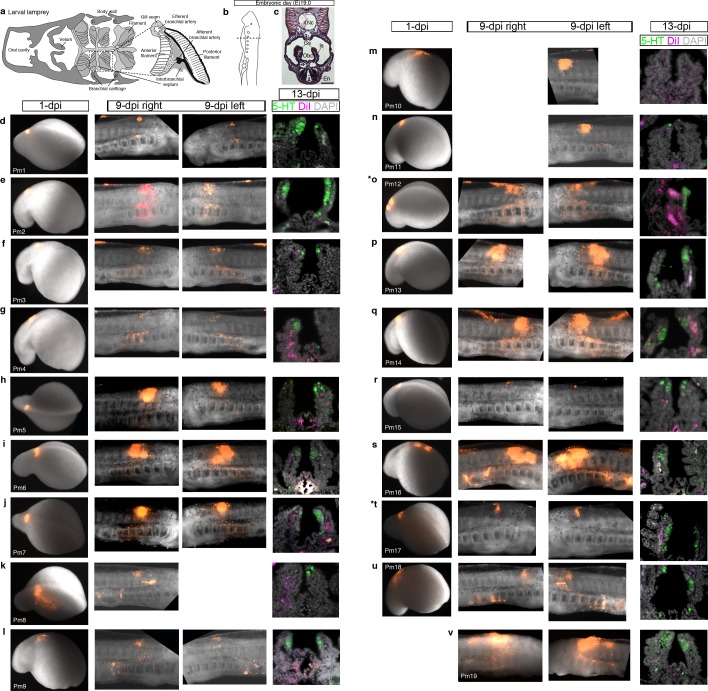 Figure 4—figure supplement 1. Confirmation of successful targeting of pharyngeal arch-destined neural crest cells in all lamprey embryos analyzed for neural crest contribution to putative NECs.For orientation, the first three panels are repeated from Figure 4. (a) Schematic larval lamprey section (modified from Barreiro-Iglesias et al., 2009) showing gill pairs in the orobranchial cavity, supported byan interbranchial septum. (b) Schematic Piavis-stage 17 (E19) lamprey (modified from Tahara,1988). Dotted line: section plane. (c) Hematoxylin and eosin staining shows internal gills as ‘stalks’ within the orobranchial cavity. (d–v) Each row shows one of the 19 lamprey embryos with DiI-labeled neural crest derivatives near serotonergic putative NECs at the final analysis. The first panel shows the site of DiI injection at one day post-injection (dpi) (missing for embryo Pm19); the second and third panels show DiI-labeled neural crest cells in the branchial arches in right and/or left-side views at 9-dpi; the fourth panel shows a view of the internal gills in section at 13-dpi (for section plane, see dotted line in panel a), showing DiI contribution to gill support cells, but not to the putative NECs (serotonergic cells) in the gill epithelium. Asterisks indicate the embryos from which data are shown in Figure 4 (Pm12 and Pm17). 5-HT, serotonin; En, endostyle; Gs, gill seam; Is, interbranchial septum; Nc, notochord; Obc, orobranchial cavity.DOI: http://dx.doi.org/10.7554/eLife.21231.011 |