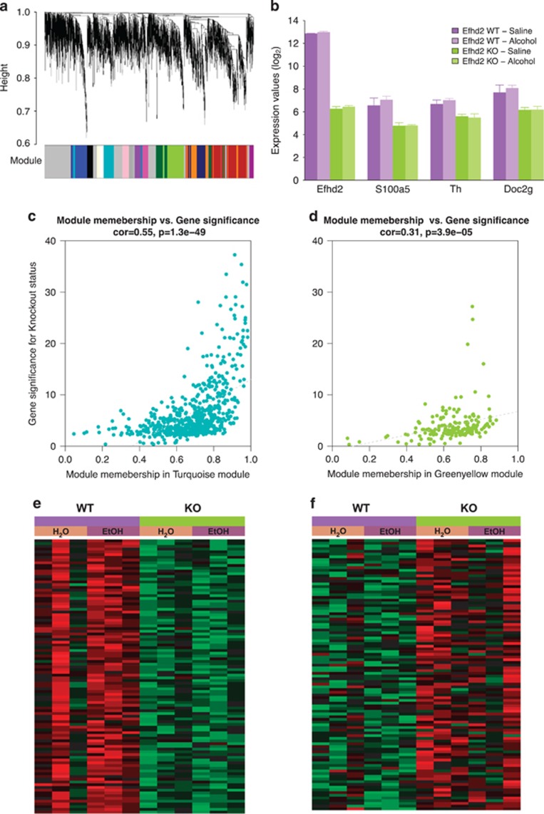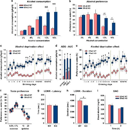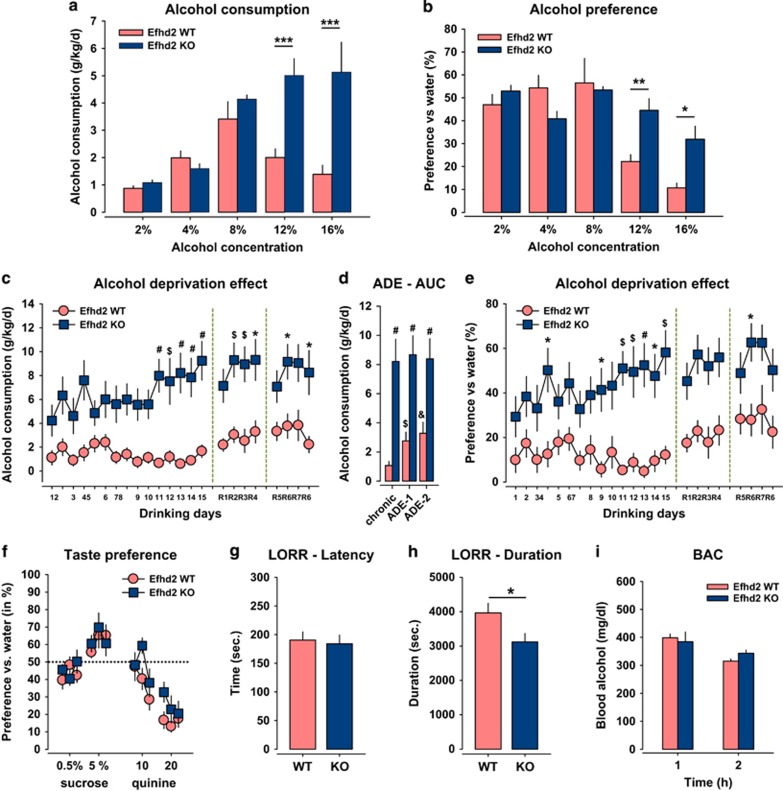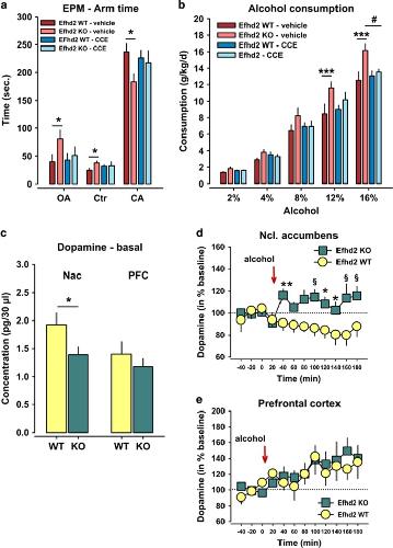 In many societies, the majority of adults regularly consume alcohol. However, only a small proportion develops alcohol addiction. Individuals at risk often show a high sensation-seeking/low-anxiety behavioural phenotype. Here we asked which role EF hand domain containing 2 (EFhd2; Swiprosin-1) plays in the control of alcohol addiction-associated behaviours. EFhd2 knockout (KO) mice drink more alcohol than controls and spontaneously escalate their consumption. This coincided with a sensation-seeking and low-anxiety phenotype. A reversal of the behavioural phenotype with β-carboline, an anxiogenic inverse benzodiazepine receptor agonist, normalized alcohol preference in EFhd2 KO mice, demonstrating an EFhd2-driven relationship between personality traits and alcohol preference. These findings were confirmed in a human sample where we observed a positive association of the EFhd2 single-nucleotide polymorphism rs112146896 with lifetime drinking and a negative association with anxiety in healthy adolescents. The lack of EFhd2 reduced extracellular dopamine levels in the brain, but enhanced responses to alcohol. In confirmation, gene expression analysis revealed reduced tyrosine hydroxylase expression and the regulation of genes involved in cortex development, Eomes and Pax6, in EFhd2 KO cortices. These findings were corroborated in Xenopus tadpoles by EFhd2 knockdown. Magnetic resonance imaging (MRI) in mice showed that a lack of EFhd2 reduces cortical volume in adults. Moreover, human MRI confirmed the negative association between lifetime alcohol drinking and superior frontal gyrus volume. We propose that EFhd2 is a conserved resilience factor against alcohol consumption and its escalation, working through Pax6/Eomes. Reduced EFhd2 function induces high-risk personality traits of sensation-seeking/low anxiety associated with enhanced alcohol consumption, which may be related to cortex function.