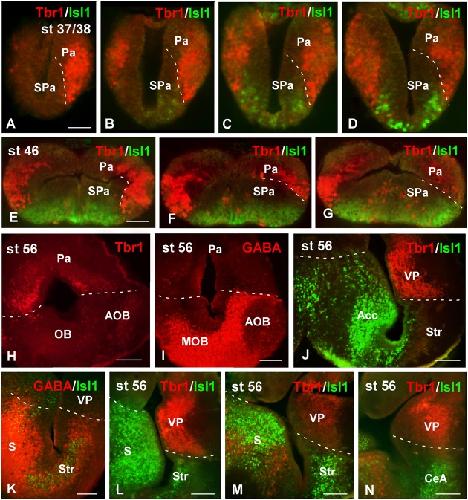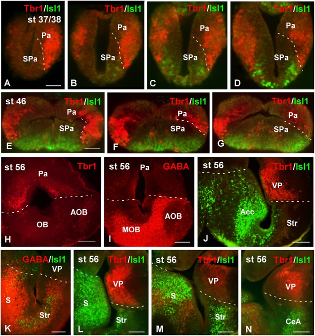 FIGURE 1. Pallial boundaries during development. Micrographs of transverse sections through the telencephalon of Xenopus laevis at embryonic (AâD), premetamorphic (EâG) and prometamorphic (HâN) stages. In each panel the developmental stage and the color code for the used markers are indicated. In the developing telencephalon, the combined immunohistochemical detection of Tbr1, expressed in the pallium, and Isl1, a subpallial marker, clearly allowed the identification of the boundary between both regions throughout the rostrocaudal extent (AâG,J,LâN). The localization of Tbr1 (H) at rostral level, in comparison with GABA (I), highlights the olfactory bulb, where GABA was very abundant, in contrast to the pallium, where the Tbr1 expression was observed (H,I). Simultaneous labeling for GABA and Isl1 discerns the SPa from the pallium (K). Scale bars = 50 μm (AâG), 100 μm (HâN). See list for abbreviations. |