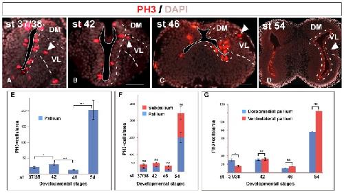 FIGURE 3. Mitotic rate. Micrographs of transverse sections through the pallium of Xenopus laevis at embryonic (A,B), premetamorphic (C) and prometamorphic (D) stages showing the distribution of PH3, marker of proliferating and mitotic cells, in combination to DAPI. During development, mitotic cells were observed in the ventricular cell layer, but also abventricularly (arrowheads in AâD). The mitotic index significantly increased at the end of the embryonic period, but it significantly decreased at early larval stages, to drastically increase later at stage 54, when a neurogenetic peak is observed (E). This pattern is observed not only in the pallium, but also when pallial and subpallial regions separately analyzed, where significant differences in their mitotic index were not observed at any stage (F). Considering separately during development the DM and the VL, major differences in their mitotic index were not observed, with the exception of the stage 37/38 when the dorsomedial proliferation is slightly higher, but it did not continue later in development (G). Scale bars = 50 μm (AâC), 200 μm (D). See list for abbreviations. ââP < 0.001, âP < 0.05. |