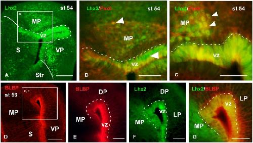 FIGURE 8. Analysis of progenitor cells at larval stages (Lhx2, Pax6, BLBP). Micrographs of transverse sections through the pallium of Xenopus laevis at the larval stage 54 showing the distribution of the progenitor markers Lhx2 (AâC,F,G), Pax6 (B,C) and BLBP (DâG). In each panel the color code for the used markers is indicated. The higher magnifications (B,E,F) are from the panels indicated in each case (white boxes in A,D). At this stage in the ventricular zone Lhx2 is expressed by virtually all cells (A,F), and those cells co-expressed Pax6 (B,C) and BLBP (G). Lhx2 expressing cells away from the ventricle, like in the medial pallium, were also labeled for Pax6 (B,C), but never expressed BLBP (G). Scale bars = 100 μm (A,D), 50 μm (B,C,EâG). See list for abbreviations. |