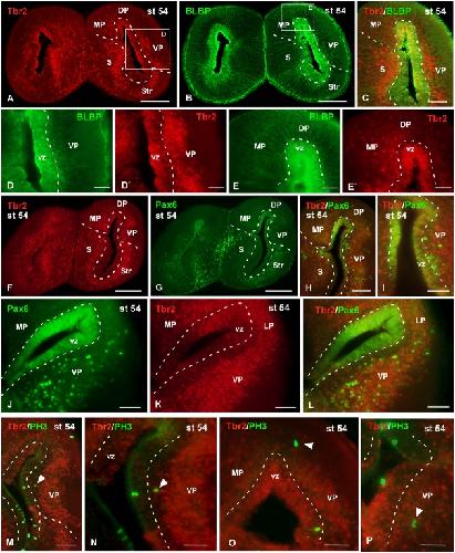 FIGURE 10. Analysis of progenitor cells at larval stages (Tbr2, BLBP, Pax6, PH3). Micrographs of transverse sections through the pallium of Xenopus laevis at the larval stage 54 showing the distribution of the markers Tbr2 (A,C,Dâ²,Eâ²,F,K), BLBP (B,C,D,E) and Pax6 (GâJ,L), and the combination of Tbr2 with the mitotic marker PH3 (MâP). In each panel the color code for the used markers is indicated. The higher magnifications (D,E) correspond to the framed areas, as indicated (white boxes in A,B). Tbr2 expressing cells were detected close to the ventricle and away from it (A,Dâ²,Eâ²,F,K) but only those cells in the ventricular zone expressed BLBP (D,Dâ²,E,Eâ²) or Pax6 (FâL). The combination of Tbr2 and PH3 showed that there are not Tbr2 mitotic cells away from the ventricle (MâP). Scale bars = 200 μm (A,B,F,G), 100 μm (C,H,JâM), 50 μm (D,E,I,N,O,P). See list for abbreviations. |