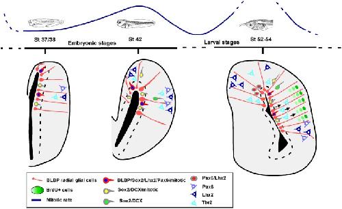 Thuret, Analysis of neural progenitors from embryogenesis to juvenile adult in Xenopus laevis reveals biphasic neurogenesis and continuous lengthening of the cell cycle. 2015, Pubmed , Xenbase