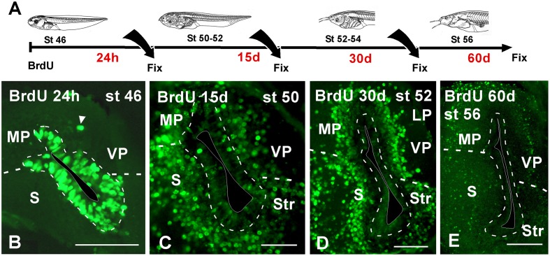 FIGURE 5. Neuronal birth during pallial development. (A) Schematic drawing illustrating the experimental approach used, in which BrdU was administrated at the stages specified and the animals were sacrificed at the larval stages indicated. (BâE) Micrographs of transverse sections through the pallium of Xenopus laevis at premetamorphic (B), prometamorphic (C,D) and metamorphic (E) stages. Twenty four hour after the BrdU administration almost all the positive cells were concentrated in the ventricular zone (B) and additionally abventricular BrdU+ cells were found (arrowhead in B). 15 days after the BrdU, labeled cells were found away from the ventricle in adjacent layers (C). Similarly, 30 days (D) and 60 days (E) after the administration, the BrdU+ cells migrated to more superficial positions. Scale bars = 100 μm (BâE). See list for abbreviations. |