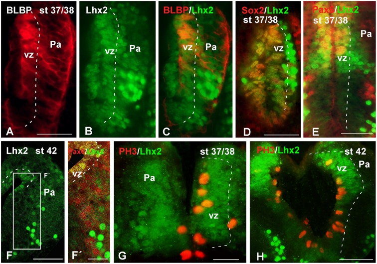 FIGURE 6. Analysis of progenitor cells at embryonic stages (BLBP, Lhx2, Sox2, Pax6, PH3). Micrographs of transverse sections through the pallium of Xenopus laevis at embryonic stages showing the codistribution of the progenitor markers BLBP (A,C), Lhx2 (B,C,EâG), Sox2 (D), and Pax6 (E,Fâ²); and the combination of Lhx2 with the mitotic marker PH3 (G,H). In each panel the developmental stage and the color code for the used markers are indicated. (F,Fâ²) Are confocal images, and the higher magnification shown in (Fâ) corresponds to the framed area indicated in (F). The BLBP (A) and the Lhx2 (B) labeling detected at stage 37/38 showed double labeled cells exclusively in the ventricle (C). The combination of Lhx2 and Sox2 also showed double labeled cells in the ventricle, but the cells detected for both markers in the mantle were never double labeled (D). In the case of Pax6, Lhx2/Pax6 double labeled cells were observed in the ventricular zone (E,Fâ²), but never away from this region, where both cell populations were intermingled (Fâ²). The labeling of Lhx2 in combination with PH3 showed that only the ventricular cells expressing Lhx2 were mitotic cells (G,H). Scale bars = 50 μm. See list for abbreviations. |