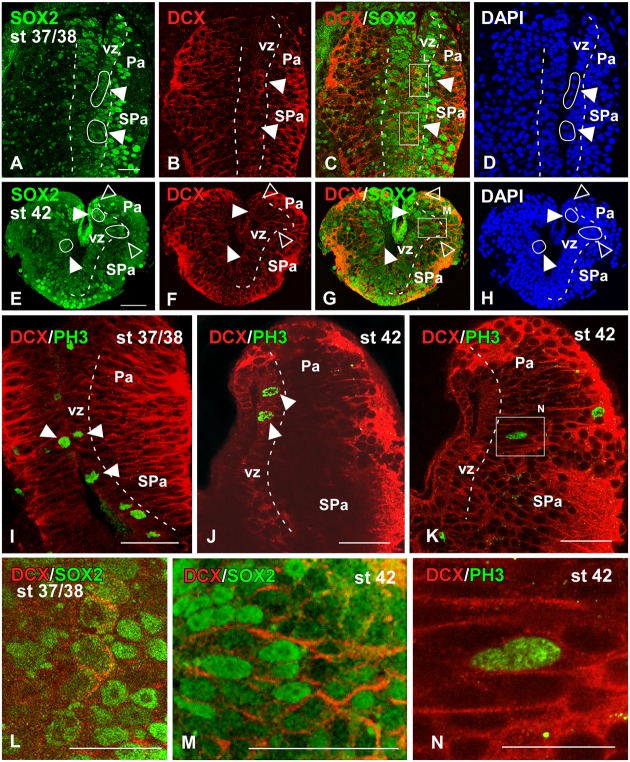 FIGURE 7. Analysis of progenitor cells at embryonic stages (Sox2, DCX, PH3). Micrographs of transverse sections through the pallium of Xenopus laevis at embryonic stages 37/38 (AâD,I,L) and 42 (EâH,J,K,M,N) showing the codistribution of the progenitor marker Sox2 (A,E) and the neuroblast marker DCX (B,F) in combination to DAPI (D,H), and the combination of DCX with the mitotic marker PH3 (IâK). In each panel the developmental stage and the color code for the used markers are indicated. All micrographs are confocal images, and the higher magnifications (L,M,N) correspond to the framed areas, as indicated (white boxes in C,G,K). At the ventricular zone there were observed double labeled cells for Sox2 and DCX (see arrowheads in AâC, EâG), and those cells were mitotic cells (see white circles and filled arrowheads in D,H). Additional double labeled cells were observed away from the ventricle (see empty arrowheads in EâH). The combination of DCX and PH3 showed double DCX/PH3 labeled cells in the ventricle and away from it (see arrowheads in I,J). Scale bars = 25 μm (AâH,L,M), 50 μm (IâK). See list for abbreviations. |